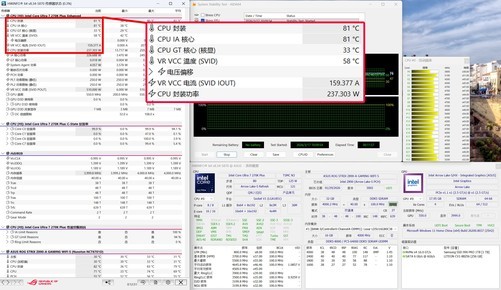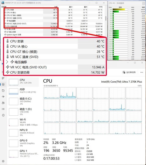 首先是酷睿Ultra7270KPlus,这颗处理器待机功耗基本在14W左右,封装温度40℃;而AIDA64FPUCPU单烤机功耗稳定在240W附近,封装温度也只有81℃,结合前面性能测试部分的各项提升来看,酷睿Ultra7270KPlus能效表现优异