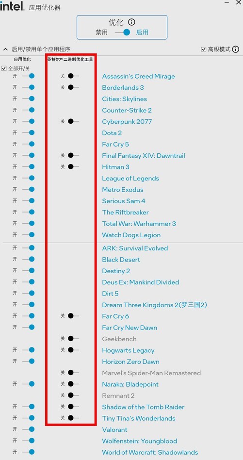 我们只需要在主板BIOS中开启DTT(老BIOS)或Intelinnovationplatformframework(新BIOS),再安装IntelApplicationOptimization,也就是英特尔应用优化器软件,即可在界面上看到目前支持的二进制优化游戏列表。后续英特尔还会快速推进更多游戏对二进制优化的支持。