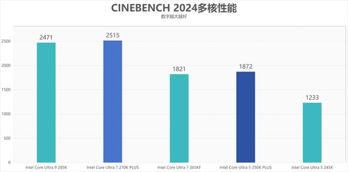 CINEBENCHR23/2024/2026三项多核性能测试,酷睿Ultra7270KPlus分别得分41982、2515以及10081;酷睿Ultra5250KPlus分别得分31177、1872以及7427。对比前代同级别处理器,三项测试酷睿Ultra7270KPlus分别提升17%、38%以及42%;酷睿Ultra5250KPlus分别提升35%、52%以及53%!