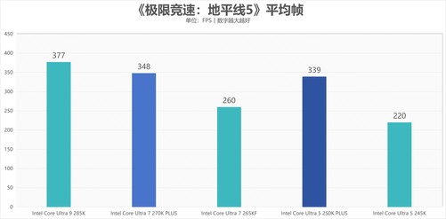 《极限竞速:地平线5》,最低画质,1080p分辨率,平均帧率分别为348fps和339fps。相对于更吃CPU性能的电竞游戏来说,3A游戏对于处理器性能的敏感度就没有那么高了,所以同等内存、显卡配置下,酷睿Ultra7270KPlus和酷睿Ultra5250KPlus平均帧率相差不算太大,但相对于前代同级别产品来说,提升幅度分别达到了34%和54%。