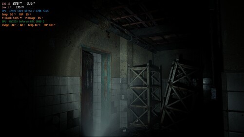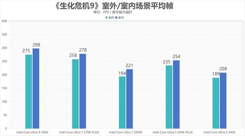 《生化危机9》我们分别测试了室外场景和室内场景的平均帧,依然是最低画质、1080p分辨率,酷睿Ultra7270KPlus和酷睿Ultra5250KPlus室外、室内平均帧率分别为258/278fps以及235/254fps,相对前代同级处理器依旧有着碾压级别的大幅升级。