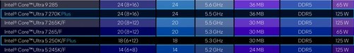 例如与前代同级别的酷睿Ultra7265K/KF以及酷睿Ultra5245K/KF相比,英特尔酷睿Ultra7270KPlus和酷睿Ultra5250K/KFPlus在核心数量方面都进行了相应提升。酷睿Ultra7270KPlus与前代酷睿Ultra9285K看齐,达到了24核(8P+16E)24线程,酷睿Ultra5250KPlus则提升到了18核(6P+12E)18线程。