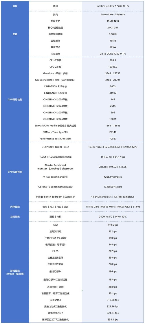 从游戏测试可以看到,酷睿Ultra200SPlus平台对比前代同级别平台有着极为显著的提升,尤其是在电竞游戏、网游方面,新一代平台的平均帧和1%Low帧表现都更为出色,酷睿Ultra7270KPlus甚至追上了酷睿Ultra9285K的水准。3A单机游戏方面,两颗新处理器的表现也都可圈可点,对于游戏玩家来说是相当值得升级的一代。