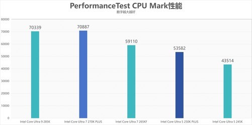 理论性能部分的最后,我们看看PerformanceTestCPUMark以及3DMarkTimeSpy的表现。前者酷睿Ultra7270KPlus和酷睿Ultra5250KPlus分别得分70887和53582分,后者分别得分22146和20925。