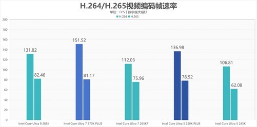 视频编码一直就是酷睿处理器的强项,酷睿Ultra200SPlus系列再度得到强化,酷睿Ultra7270KPlusH.264/H.265编码帧率分别达到了151.52fps和81.17fps,不仅比上代同级别更高,而且H.264编码速度超过了酷睿Ultra9285K。另外酷睿Ultra5250KPlus的表现也相当出色,H.264/H.265编码速度分别为136.98fps和78.52fps,两颗处理器拿来做视频内容的效率都远远超过前代同级处理器,对于视频创作者、短视频自媒体用户而言值得升级。