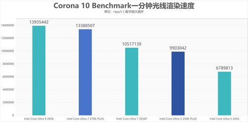 Corona10Benchmark一分钟光线渲染速度方面,酷睿Ultra7270KPlus和酷睿Ultra5250KPlus分别达到了13388507rays/s以及9903042rays/s,提升幅度分别为27%和46%。