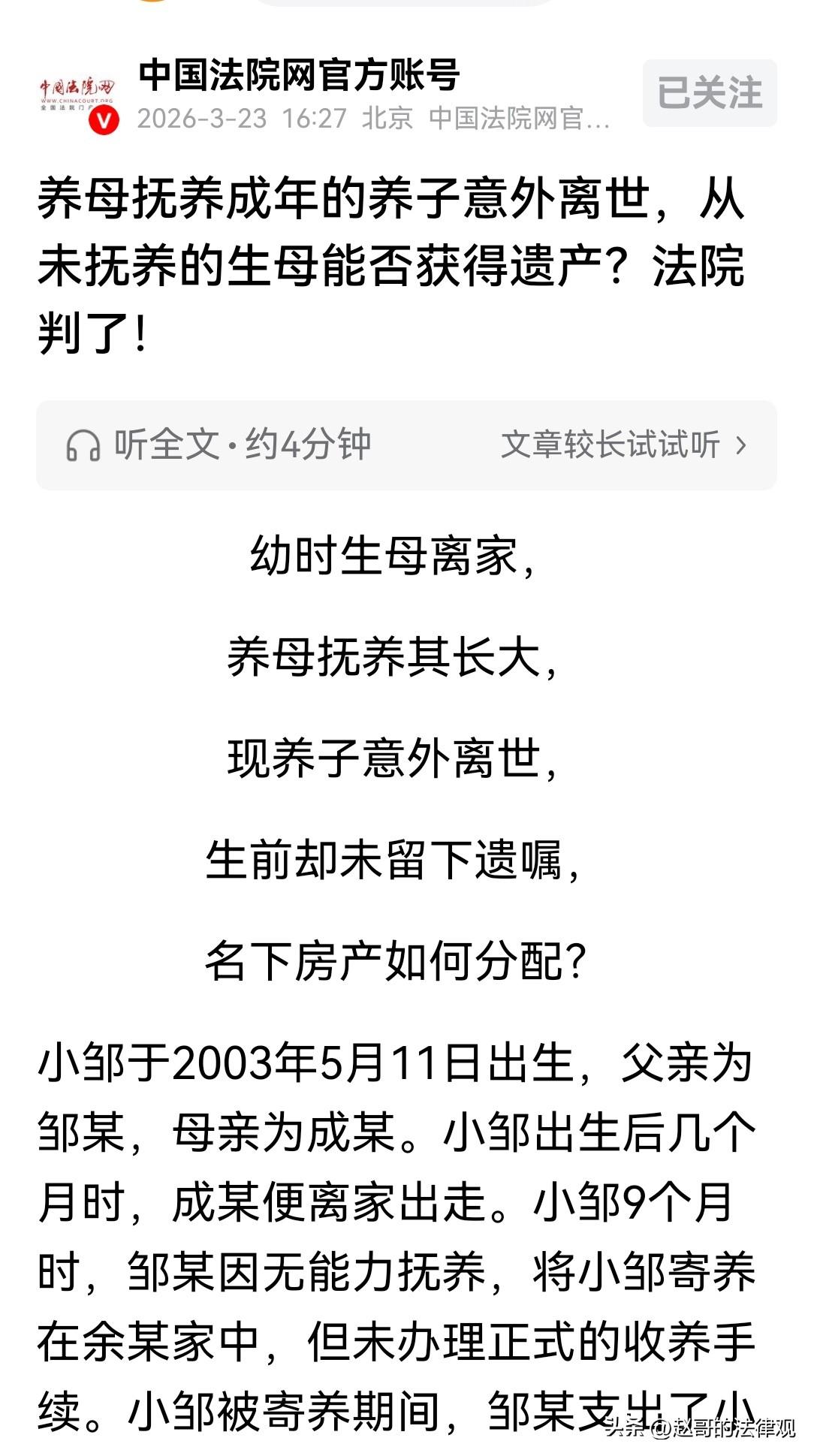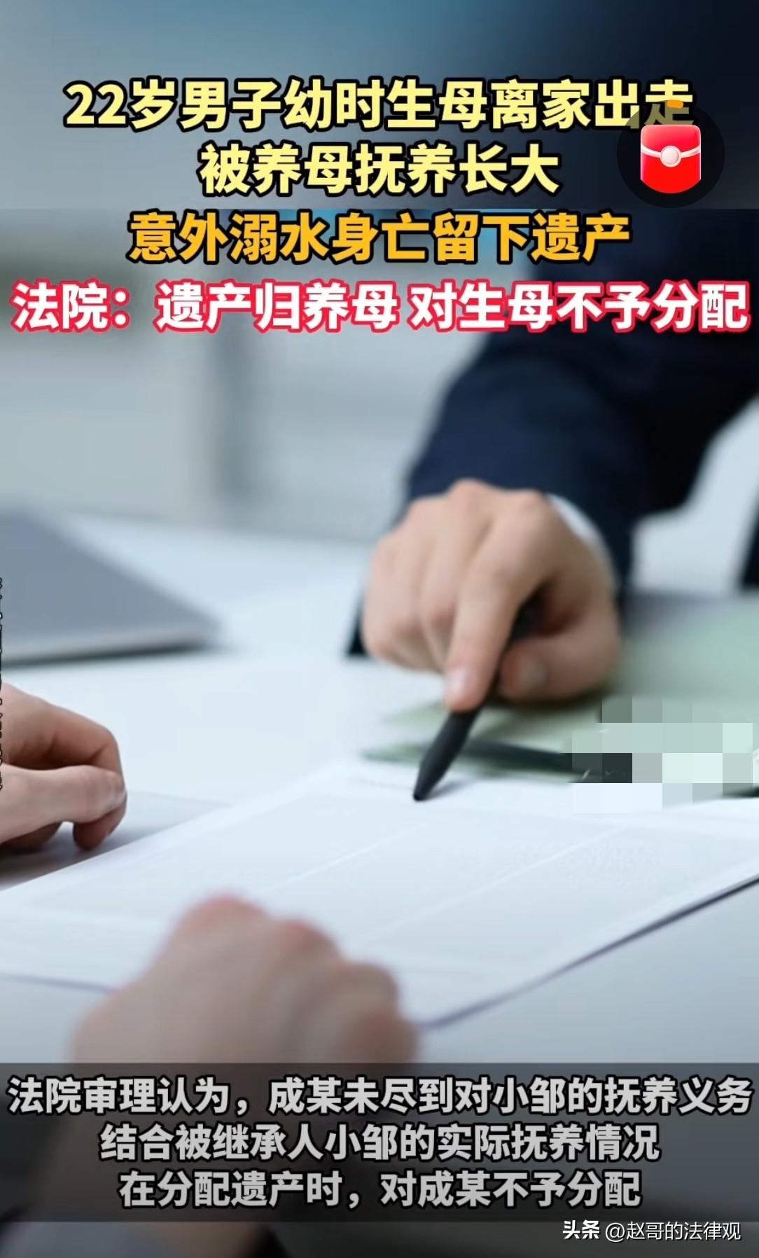 为了钱,脸都不要了!湖南株洲,女子生下儿子不久,就抛夫弃子离家出走,从此失联。儿子9个月时,亲生父亲实在没能力抚养,将孩子送给养母,养母待他如亲生,万般呵护男孩长大,但没办正式的收养手续。不料,男孩22岁时意外身亡。养母给她操办了后事,至此女子一直没有露面,后来,她听说儿子和养母有一套共同的房子,就跳出来要求继承儿子的份额,双方闹上法庭,法院这样判了! 邹某和成某婚后生下儿子小邹,但成某嫌弃丈夫,儿子出生才几个月,她就狠心离家出走,从此再无音讯。 小邹9个月大时,父亲因实在没能力抚养,便把儿子寄养在了余某家里。 余某是个善良的人,看着襁褓中的男孩,心里满是怜惜。 从此,她便把男孩当成亲生儿子一样照顾。 虽说邹某会承担儿子读书期间的学费和生活费。 可孩子成长过程中,吃穿用度、头疼脑热,哪样不需要钱? 大部分费用,还是余某默默地掏了腰包。 在余某的悉心照料下,小邹一天天长大。 他懂事乖巧,知道余妈妈对自己好,所以学习特别努力,就想着以后能好好报答余妈妈。 余某心里也满是欣慰,觉得再苦再累都值得。 终于小邹长成了大小伙子,他努力工作,和养母一起攒钱买了一套房子,房产证上写着母子共同共有。 这房子也是母子俩温暖的小家,余某想着要在这房子里给儿子娶媳妇,还要抱孙子。 然而,麻绳总挑细处断,命运似乎总爱捉弄苦命人。 2025年4月16日,一个平常的日子,却成了22岁小邹生命的终点。 小邹竟意外溺亡,消息传来,余某整个人被击倒,她的天塌了! 毕竟这孩子是她从9个月大,拉扯到20多岁。 她无法相信,昨天还活蹦乱跳,和自己有说有笑的孩子,今天就这么没了。 余某强忍着悲痛,为养子操办了丧葬事宜。 邹某也赶了过来,他出了丧葬费用,可那个从小就抛弃小邹的生母成某,连面都没露。 余某看着小邹的遗像,泪水止不住地流,把孩子拉扯这么大,和亲生儿子没什么两样。 小邹走了,可生活还得继续,可他留下的那套房子成了问题。 因为小邹生前没留遗嘱,这房子属于他的份额,作为遗产该怎么分配,成了大家争论的焦点。 成某也得知儿子和养母有一套共同的房子,房子有一半属于儿子,那么她也有继承的权利! 确实,根据法律规定,邹某、成某作为小邹的第一顺序继承人有权利各分一份。 可余某呢,她从小把小邹养大,付出了多少心血,就因为没那一张收养手续,什么都得不到。 事闹到了法院,法院审理过程中,邹某做出了一个让余某意想不到的决定。 他明确表示,把自己应继承的,小邹房屋遗产份额全部赠送给余某。 法院审理后认为,这不仅仅是一起简单的遗产分配案,背后还涉及到亲情、责任和道德。 根据法律规定,被继承人没留遗嘱,遗产得按法定继承分配。 案涉房屋,是小邹和余某共同共有,但又没书面协议说份额咋分。 而小邹和余某,有着实际抚养关系。 法院最后认定,房子小邹和余某各占50%份额。 邹某和成某作为第一顺序继承人,本来都有一半遗产的分配权。 余某虽然不是继承人,但因为她对小邹抚养多,也能分到遗产。 反观成某,在小邹出生几个月就离家,这么多年没尽过一点抚养义务。 法律,也不会惯着这种生而不养的人。 法院依据《民法典》的规定:同一顺序继承人继承遗产份额一般均等,但有扶养能力和条件却不尽义务的,分配遗产时,应当不分或者少分。 成某虽是亲生母亲,但她没尽到抚养小邹的责任,在分配遗产时,法院决定对她不予分配。 那么,邹某享有的小邹房屋50%份额的遗产咋分呢? 邹某已决定,把属于他的份额全部转让给余某,这是他对自身权利的处分,被法院采纳。 最后,小邹房屋50%份额的遗产全部由余某继承。 再加上余某本来就享有这房子另外50%份额的所有权。 最终,法院判决,案涉房屋归余某所有,余某享有100%产权份额。 判决结果一出来,余某心里五味杂陈。 她为小邹的离去伤心,又为自己这么多年的付出得到了法律认可而欣慰。 生而不养的小邹亲妈成某,怎么也没想到,自己会因为当初的狠心,不仅失去了儿子,也失去了遗产分配的机会。 这也说明,真正的亲情,并不只是靠血缘来维系。 谁承担了养育的责任,谁就应该得到法律的关怀,和情感的尊重。 法律不会让那些失职的人钻空子,也不会让默默付出的人寒了心。 对此,你怎么看?