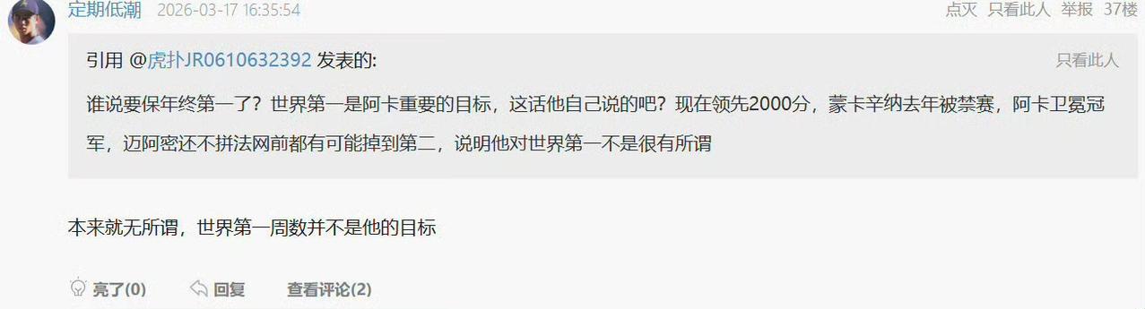 阿尔卡拉斯爆冷无缘迈阿密16强,但怎么看都像是有意的…… 他把巡回赛全当表演赛热身赛,不在乎胜负,浪到哪儿算哪儿。世界第一周数本就不是他追求的目标。 图二图三比较精辟地说明了原因。