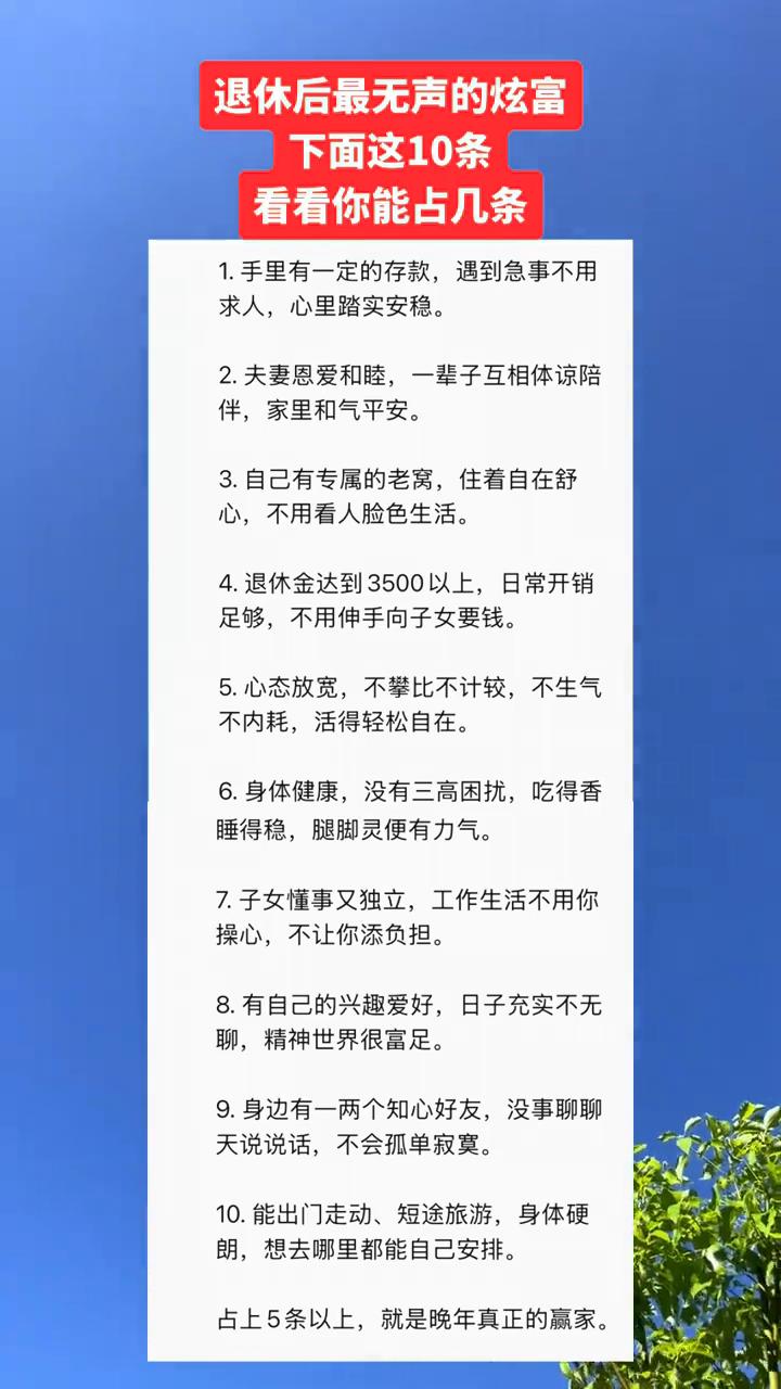 退休后最无声的炫富,下面这10条看看你能占几条? ·1.手里有一定的存款,遇到急