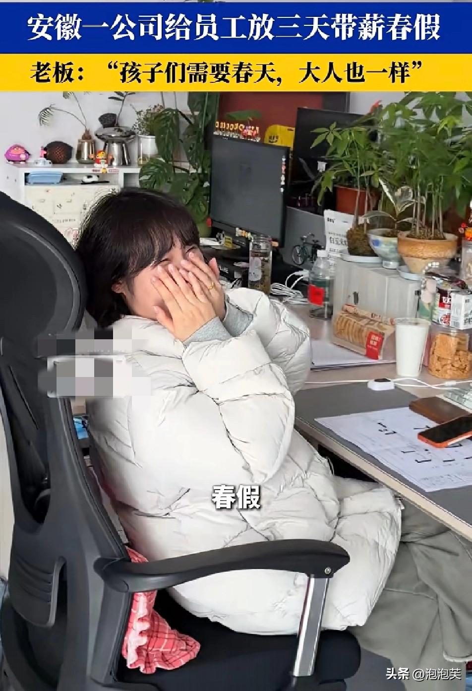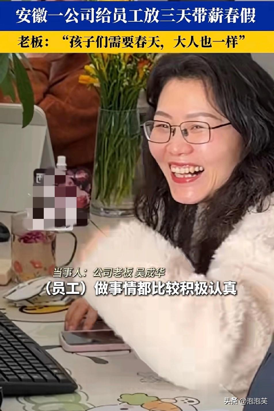 别人家的老板 安徽广德一家公司火了 老板直接给全体员工 放3天带薪春假,还说“孩子需要春天,大人也一样”。 起因是看到学生放春假,员工没人带娃,老板干脆跟着放假 让大家好好陪家人、踏青春游 公司业绩稳定,老板也不在乎这三天时间 还说休息好了,业绩反而会像春天一样“野蛮生长” 这波操作直接把员工感动哭,网友纷纷喊话 这样的老板请给我来一打 你羡慕这样的公司吗 你希望自己公司也放春假吗
