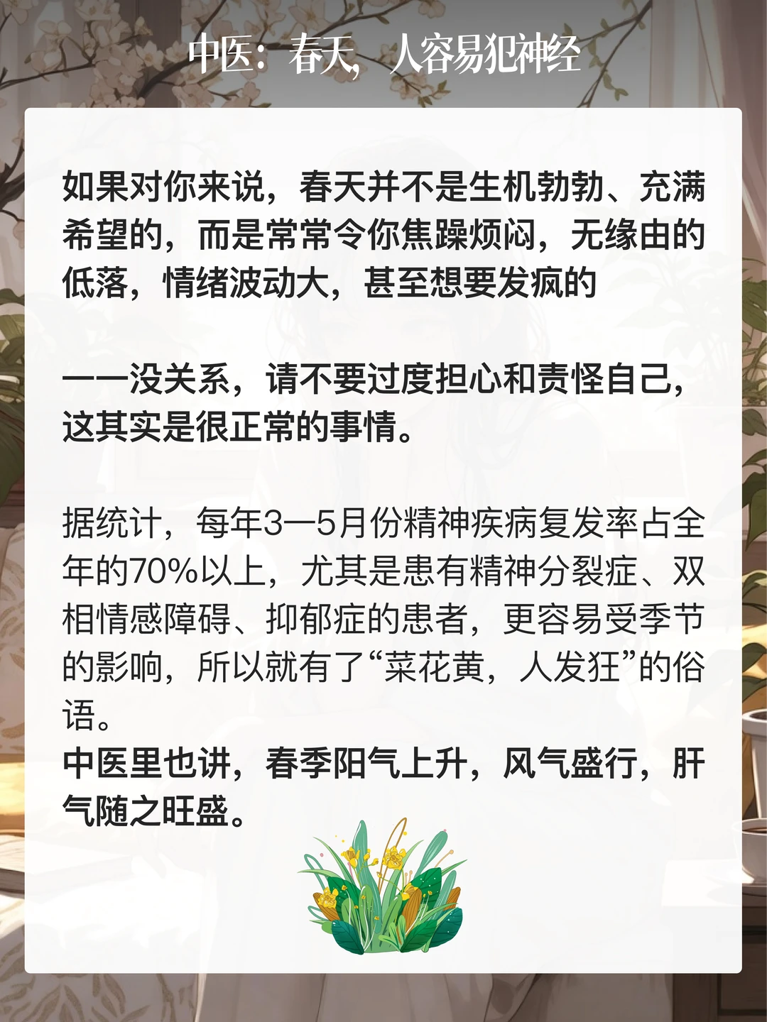 如果对你来说,春天并不是生机勃勃、充满希望的,而是常常令你焦躁烦闷,无缘由的低落,情绪波动大,甚至想要发疯的一一没关系,请不要过度担心和责怪自己,这其实是很正常的事情。 据统计,每年3一5月份精神疾病复发率占全年的70%以上,尤其是患有精神分裂症、双相情感障碍、抑郁症的患者,更容易受季节的影响,所以就有了“菜花黄,人发狂”的俗语。 中医里也讲,春季阳气上升,风气盛行,肝气随之旺盛。很多人春天情绪失控,主要是因为春天肝气太旺了,肝火太旺,疏泄不畅,就可能导致情绪郁结,出现烦躁、易怒、焦虑感;但如果肝气过于疏泄,也可能引起躁狂等情绪。