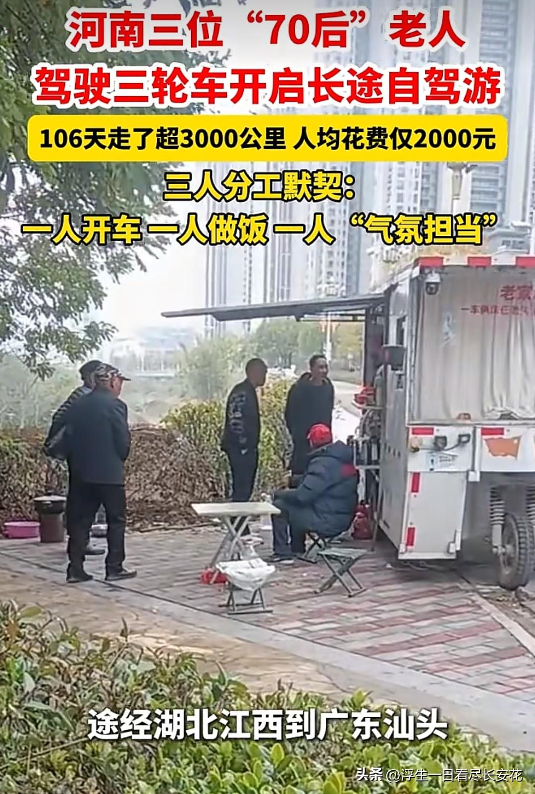 看到河南三位“70后”老人开着三轮车,用106天走了3000多公里,人均只花2000元,心里突然被戳中了——这不就是我们常说的“老了也要为自己活一次”吗? 从动机和心理来看,这些老人其实是在挣脱“老年就该在家带娃、养老”的刻板印象。就像56岁自驾游的苏敏阿姨说的,“前半生忍了又忍,后半生无需再忍”,他们大半辈子都在为家庭、为子女付出,现在终于想为自己活一回,去看看没见过的风景,找回属于自己的生活。而且这种结伴出行,也能缓解老人的孤独感,三个人分工明确,有人开车、有人做饭、有人活跃气氛,既能互相照应,又能在旅途中找到新的社交和乐趣。 以后会不会有更多老人这样做?答案大概率是肯定的。现在的老人越来越注重精神需求,不再满足于“吃饱穿暖”的生活,加上经济条件的改善和出行方式的多样化,像这种低成本的三轮车自驾游,会成为很多老人的选择。就像之前的麦子阿姨,种完麦子就开着三轮车去云南,还有76岁的张仁连带着老伴和孙子,开着三轮摩托走了2万公里,这些案例都在说明,老人的生活可以有更多可能性。 这背后其实暴露了社会对老年群体的认知正在改变,也反映出我们的大环境越来越包容。过去我们总觉得老人就该待在家里,现在我们开始尊重他们的选择,支持他们去追求自己的梦想。但同时也能看到,老年出行还有很多需要完善的地方,比如适合老人的出行设施、安全保障等,这些都是我们需要关注的问题。如何让老人既能“走出去”,又能“走得安心”,是整个社会都该思考的事。对此,大家怎么看呢?欢迎留言。