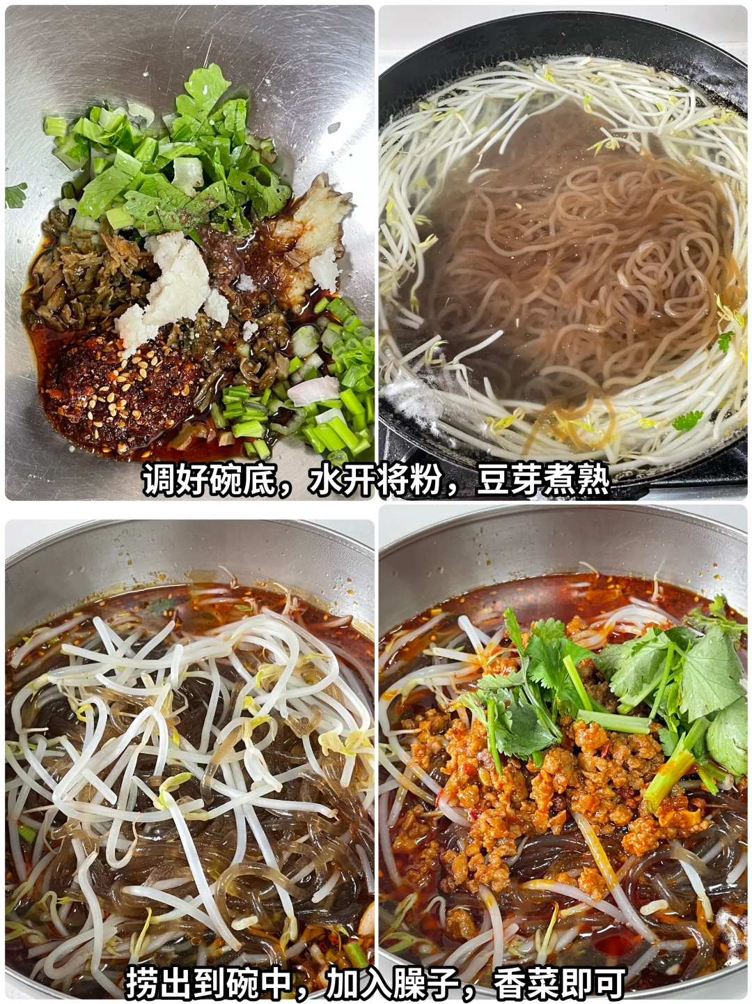 姐妹们,今天给大家出一个酸辣粉,毫不夸张,我觉得这个酸辣粉都可以出摊,做法也是巨简单,喜欢的姐妹试一试 🌶️食材:肉末,豆芽,粉 👩🍳做法: 1⃣️ 肉末放入一点料酒,盐,胡椒粉腌制10分钟。起锅烧油,油热将肉末炒熟,加入豆瓣酱,蒜,火锅底料炒香,加一碗清水煮5分钟,盛出备用 2⃣️ 碗底放入适量的葱,蒜泥,芹菜,梅干菜,花椒粉,盐,鸡精,1勺生抽,1勺半醋,1点猪油,1勺辣椒油备用 3⃣️ 锅中水开,放入豆芽煮熟,调好的碗底加入汤,再放入豆芽粉,加入炒好的臊子,撒上香菜即可