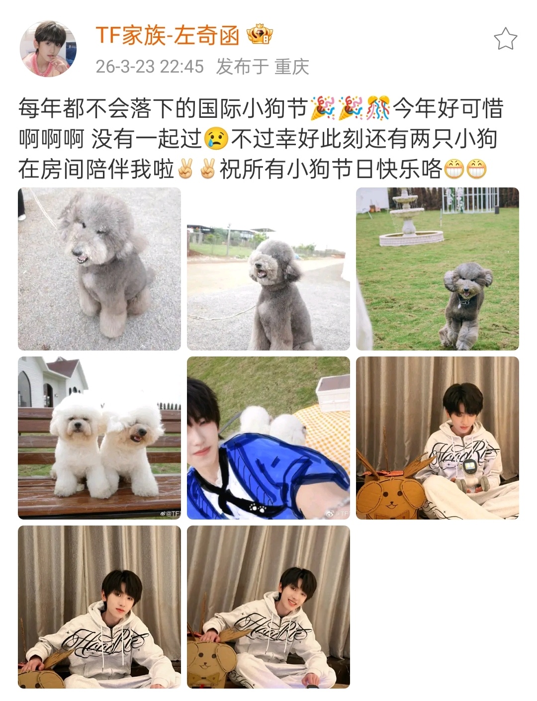 左奇函祝所有小狗节日快乐左奇函——每年都不会落下的国际小狗节🐶“今年好可惜啊啊啊 没有一起过😢不过幸好还有两只小狗在房间陪伴我啦✌🏻祝所有小狗节日快乐咯” 左奇函每年都不会落下的国际小狗节