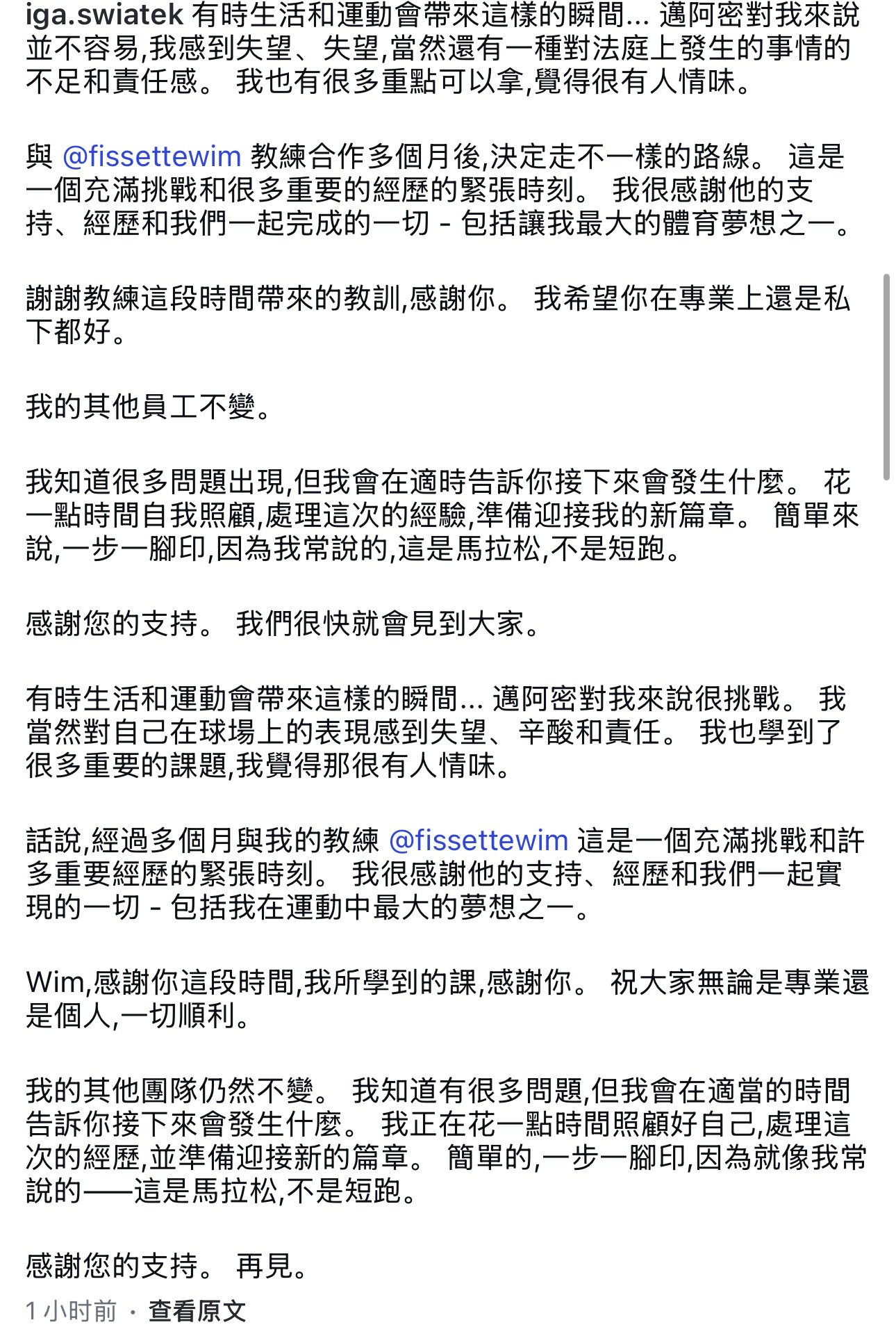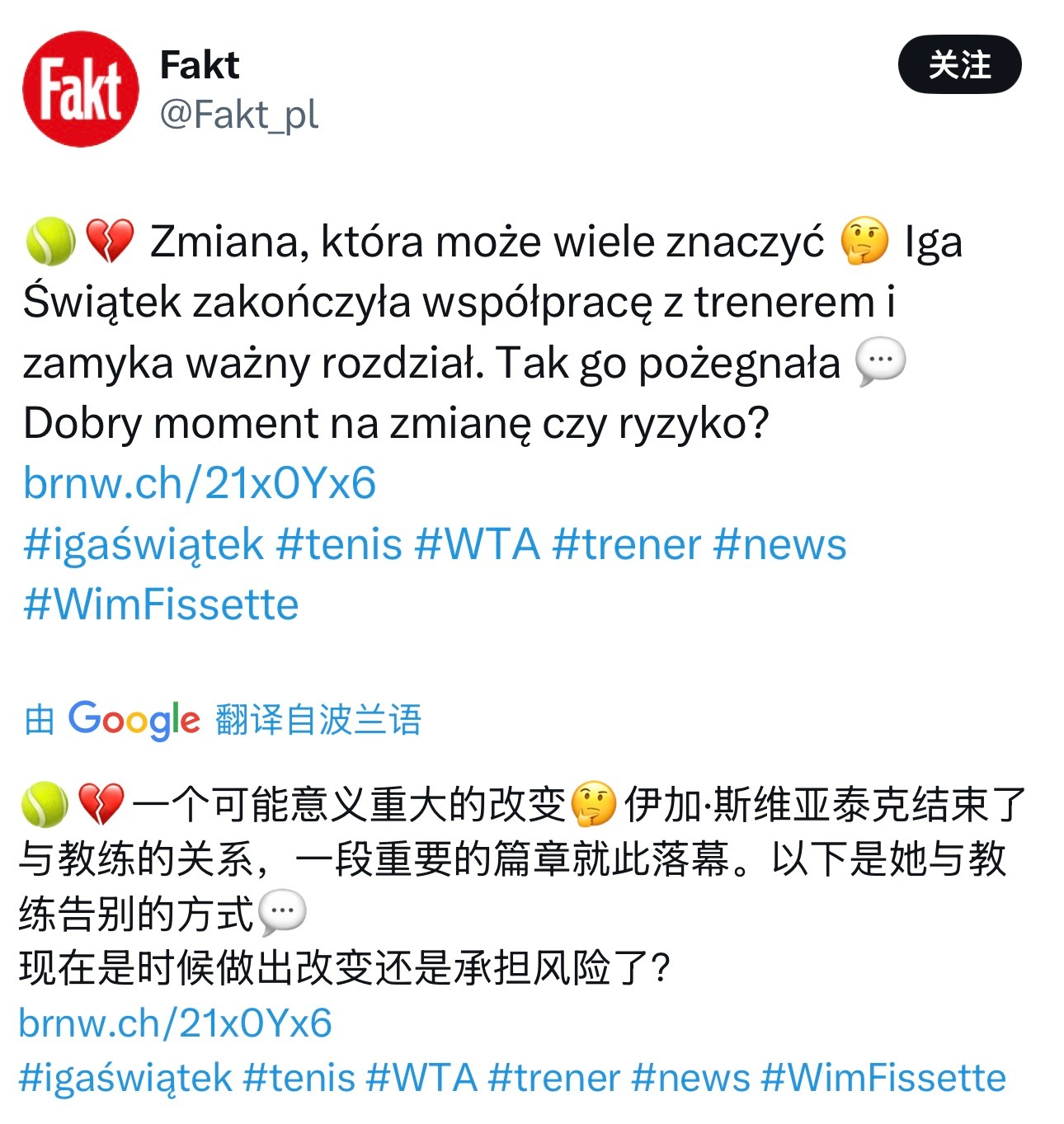 斯维亚泰克与费塞特结束合作关系!!!!