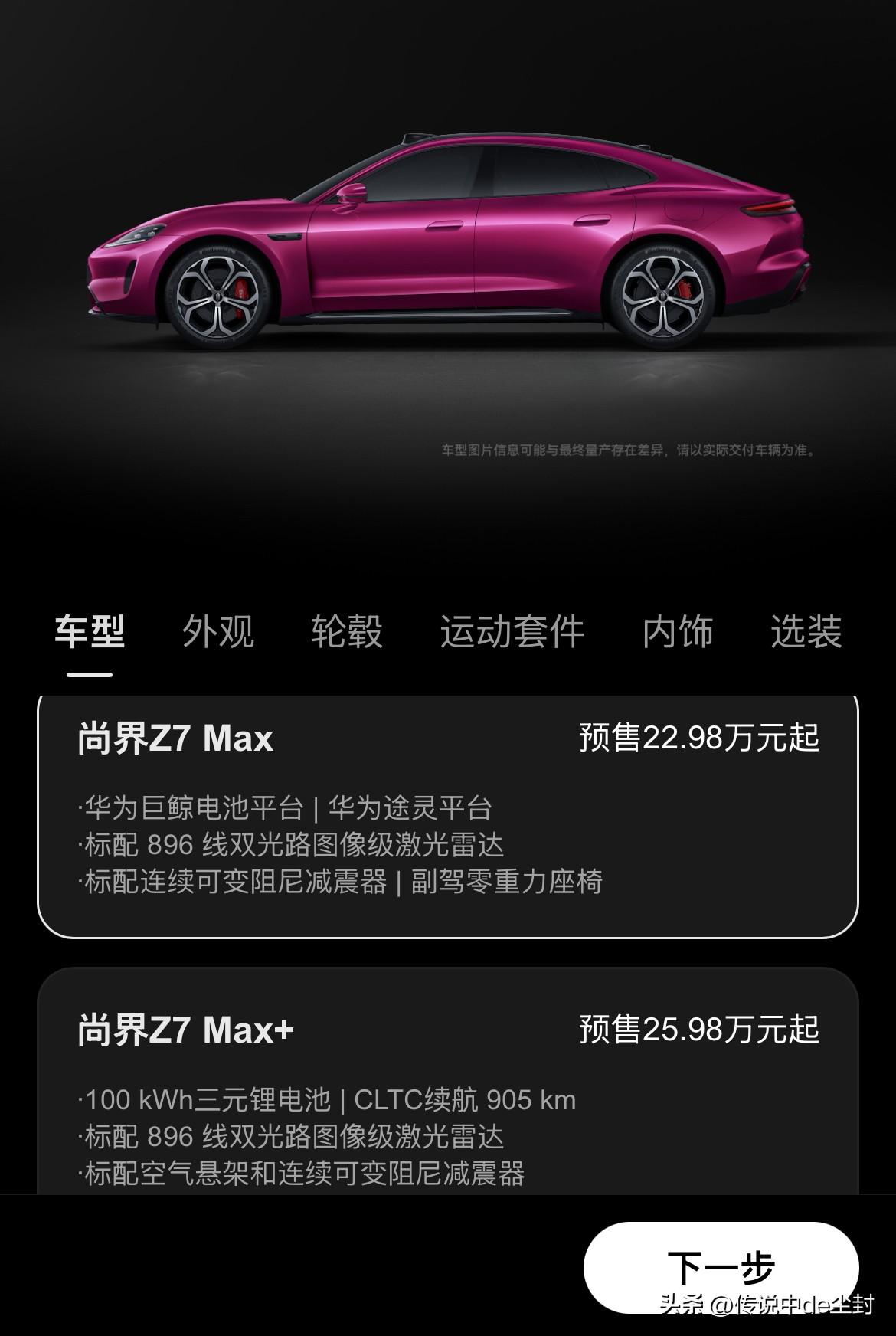 订单战报来了。 尚界Z7/Z7T小订突破18000台,用时3小时。 作为一款直面特斯拉model 3和小米新一代SU7鸿蒙系的纯电轿跑,这个订单感觉怎么样? 看了下尚界Z7的订购页面(图二),预售价22.98万的Max版就有巨鲸平台和途灵平台,再加上896线激光雷达,好像已经挺全面的感觉,毕竟智驾是灵魂,905km续航和空气悬架倒可能没有那么的刚需…… 到时候看吧,我现在反正特别好奇尚界Z7系列正式上市后的价格与销量表现。 咱们一起拭目以待……