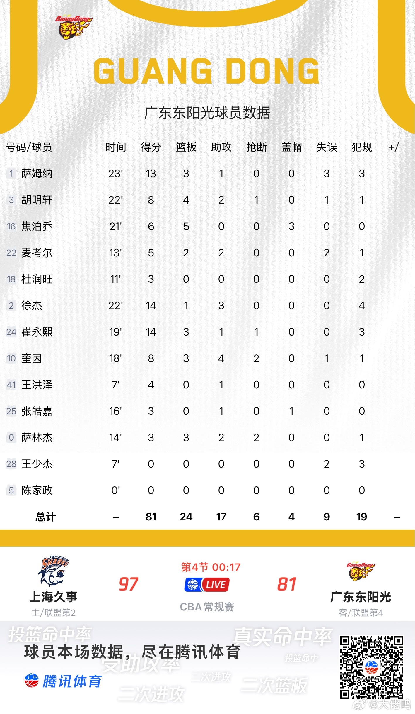 上海男篮vs广东男篮预料之中的一场大败,上半场还稍微能扳一下手腕,下半场就一泻千里了……理解,广东主场都打不过,再加上近期全队心气低沉、状态全无,客场就别想了,肯定没得打,也基本没什么亮眼的表现,就一直被压制!才3人得分上双,足以说明一切了!看看老杜仿佛又老了几岁,压力太大了最近,唉太多困难都不知道如何改起,谁来帮帮广东队帮帮杜指导啊?鸣聊体育