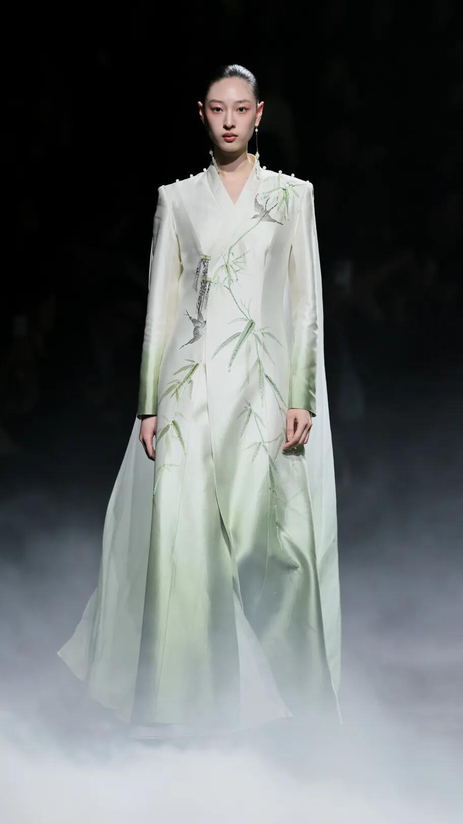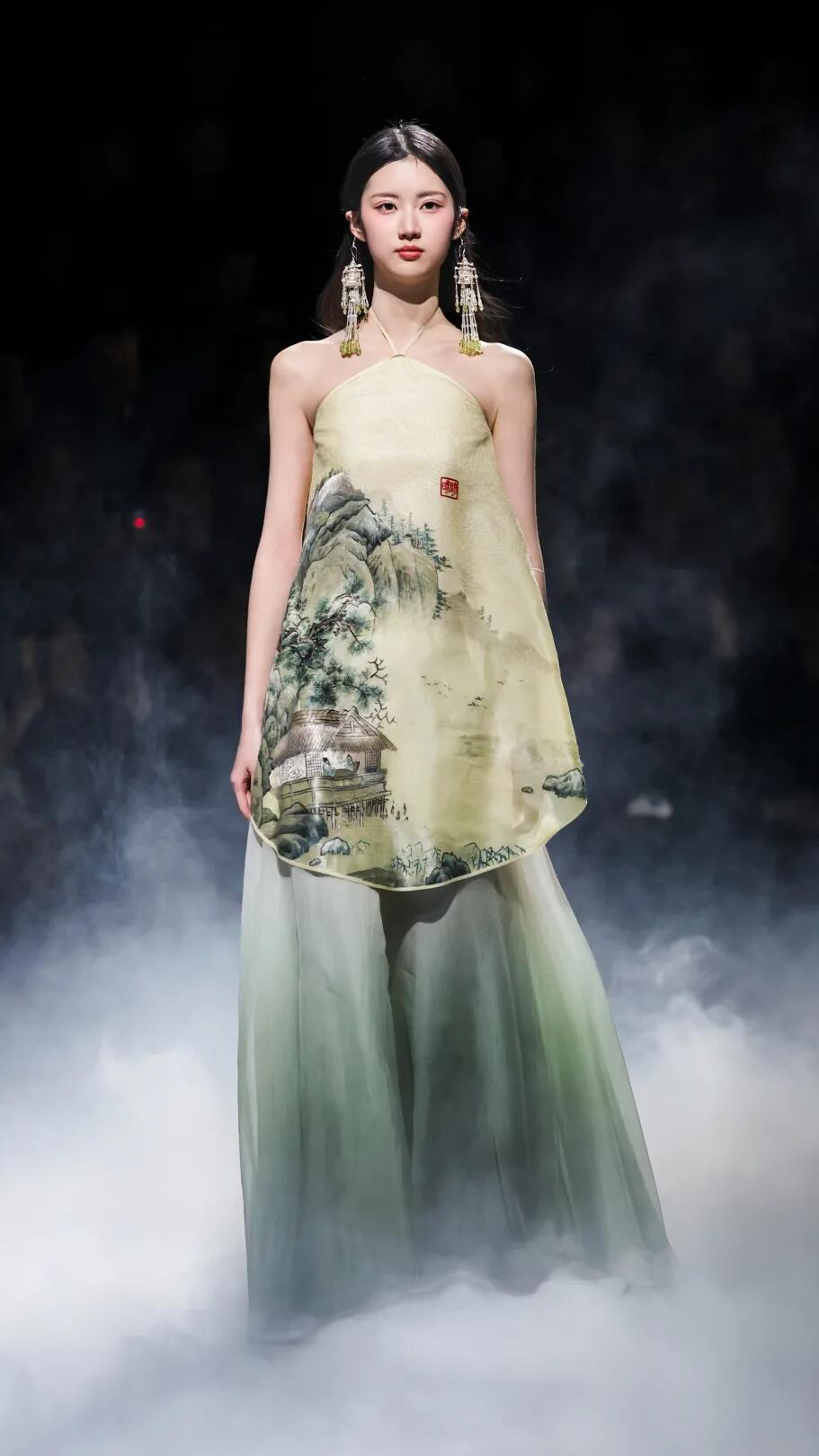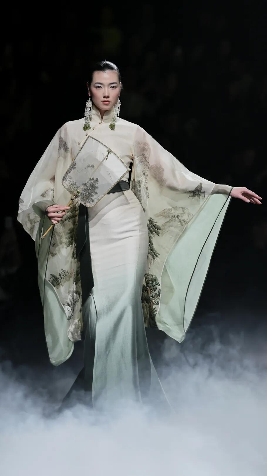 时装周中国国际时装周直击时尚幕后 熊英·盖亚传说|中国国际时装周开幕秀✨中国国际时装周以「锐意新生」为主题,开幕秀由熊英·盖亚传说担纲,带来「絮落」系列大秀。品牌以东方哲学为根基,继「月」耀巴黎、「花」开米兰后,再度向世界讲述中国故事。本季「宋韵清和·黛影含烟」系列承宋式极简风骨,取宋人留白写意之境,以茶汤染绢为底,墨青黛绿层层晕染,晕开江南山色的清和雅静。光影流转间,尽显空灵诗意,将千年东方雅韵裁成可穿于身的水墨长卷,诠释人与万物和谐共生的东方哲思。