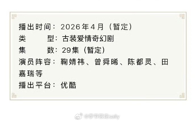 鞠婧祎 曾舜晞 陈都灵 田嘉瑞(排名不分先后)主演《月鳞绮纪》播前招商,预计4月