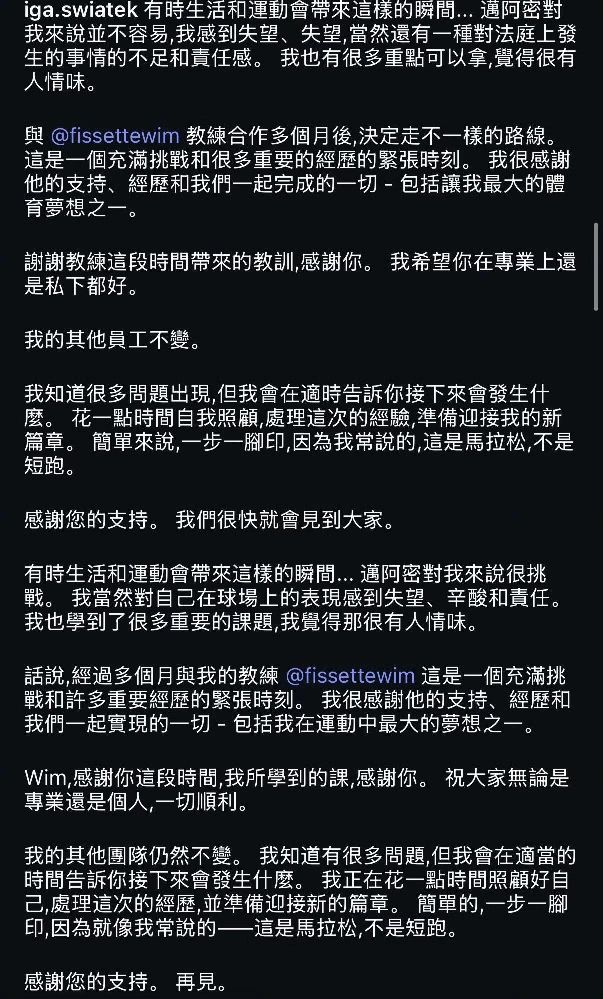 突发!斯瓦泰克与费塞特分手,结束一年半的师徒关系。合作期间费塞特助斯瓦泰克夺得温网女单冠军,世界排名从前10边缘重回TOP2。 这一天还是来了,去年红土成绩惨淡以为要结束合作了,没想到拿下温网又续到现在。