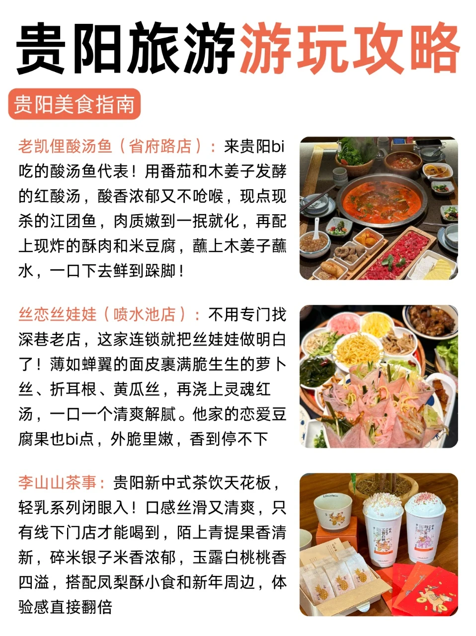 ⭕️p9-p10就是美食指南啦~吃了很多但是没全写,只写了我自己觉得真的很不错的,比如李山山茶事,贵阳奶茶轻乳系列都给我冲!