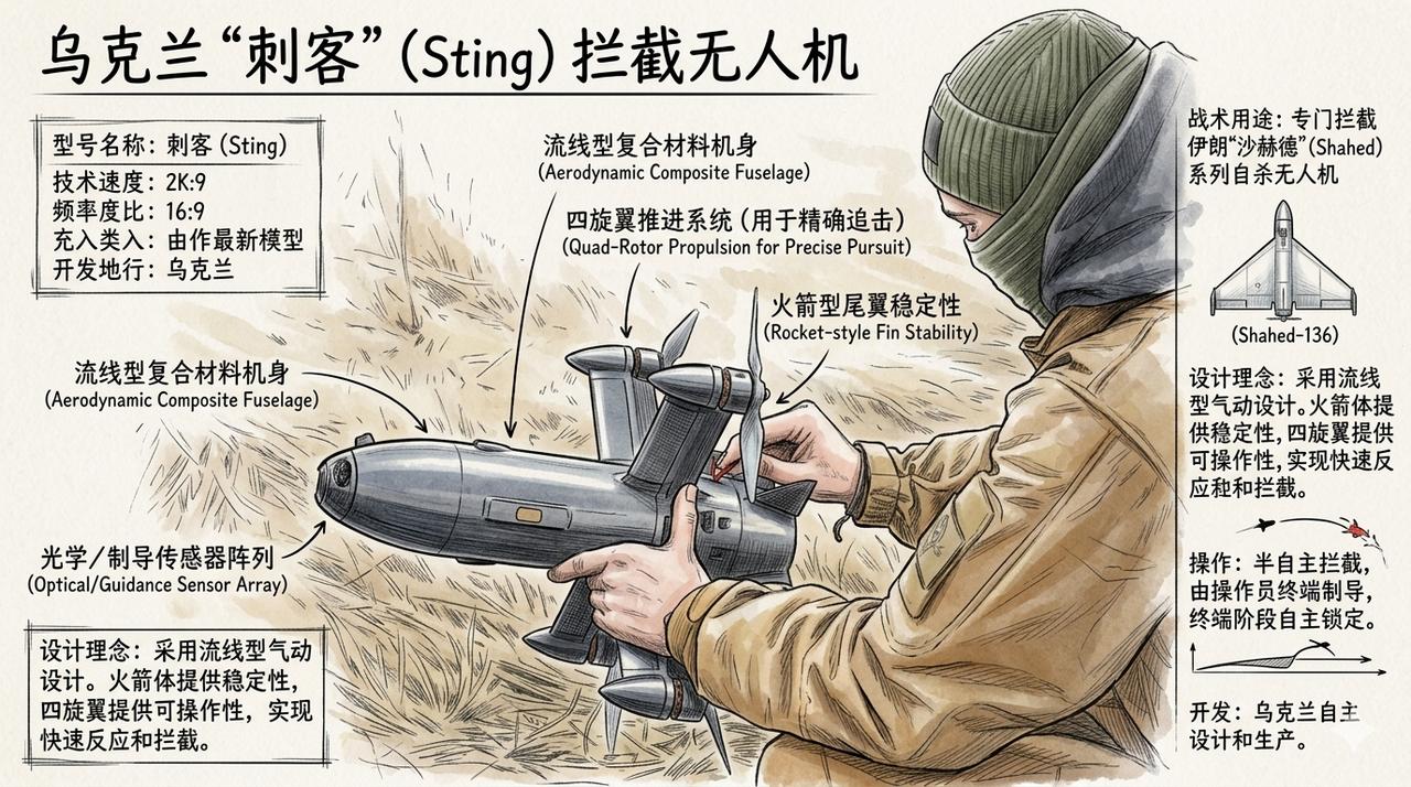 乌克兰的反无人机无人机,也叫拦截无人机,是俄乌冲突中发展最快、最具颠覆性的防空手段之一,尤其在2025年以后成为乌克兰低成本防空体系的核心支柱。 传统的防空导弹,如爱国者,单枚成本动辄数百万美元,用来拦截单价仅约3-5万美元的“沙赫德”极其不划算。乌克兰由此开发了拦截无人机,单价通常在 $1,000 至 $2,500 之间,实现了以极低成本抵消敌方空中威胁的战略目标。 这些无人机主要用来对抗俄罗斯大量使用的伊朗系Shahed-136/131巡飞弹/攻击无人机,以及侦察无人机、Gerbera诱饵机、部分FPV自杀无人机等低慢小目标。 2025年底到2026年初,拦截无人机已多次承担70%以上的Shahed击落任务(尤其基辅等核心区域)。乌军组建了很多机动防空小组 + 拦截无人机,形成所谓的“反无人机穹顶” 最夸张时期一天生产1500+架,库存甚至出现过剩,生产能力超过消耗2-3倍的阶段,极大缓解了昂贵导弹的消耗压力,让乌克兰在面对每月数百上千架Shahed饱和攻击时还能维持基本防空。 目前乌克兰有超过20家公司在量产此类无人机,其中几个代表型号尤为出众: Sting (刺客):四旋翼构型,像个手持导弹大小。时速可达 343 km/h,航程 25-37 km,采用流线型气动设计,专门针对“沙赫德”。 Bullet (子弹):高速冲刺型拦截器,具备极强的末端锁定能力。