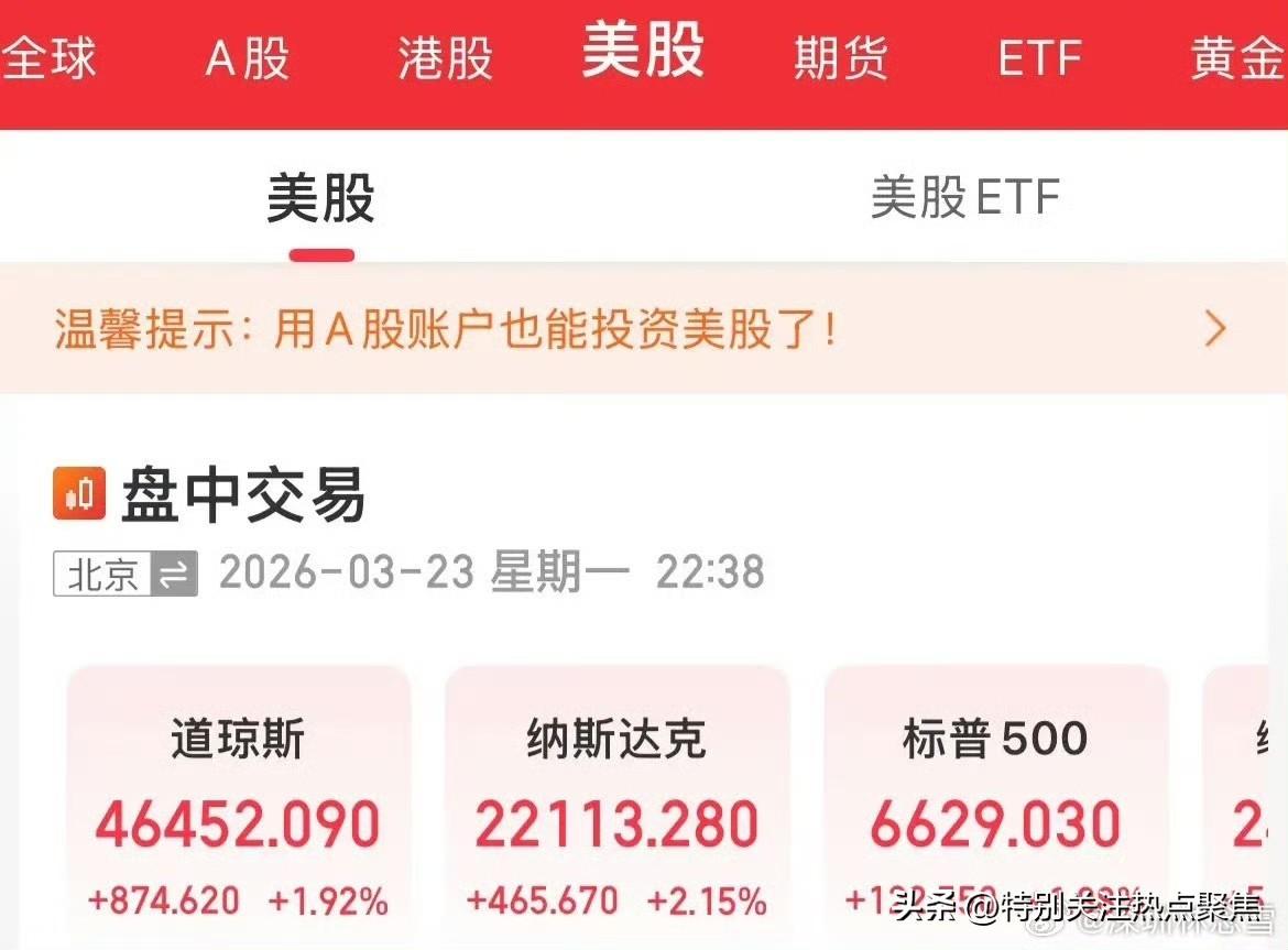深夜!大涨超1000点!特朗普宣布:同伊朗已形成协议要点!原油暴跌黄金白银剧烈波动 2026 年 3 月 23 日全球市场剧烈波动综述:美伊协议预期引爆股市,贵金属遭遇抛售 受美国总统特朗普宣布“美伊可能在 5 天内达成协议”的消息刺激,全球风险资产情绪大幅回暖,而避险资产则出现剧烈回调。截至北京时间 3 月 23 日晚间,美股三大指数集体高开高走,道琼斯工业平均指数上涨超 1030 点(涨幅 2.26%),纳斯达克指数涨 2.34%,标普 500 指数涨 2.09%。科技股与中概股全线走强,博通、特斯拉涨幅显著,小鹏汽车、知乎等中国资产亦大幅拉升;欧洲主要股指同步上涨,德国 DAX 指数和欧洲斯托克 50 指数涨幅均超 2%。与之形成鲜明对比的是,地缘政治缓和预期导致避险资金迅速撤离,现货黄金盘中一度暴跌近 9%,跌破 4100 美元/盎司关口,现货白银也出现大幅跳水 。需注意的是,尽管美方释放积极信号,伊朗方面此前曾否认与美国进行对话,市场后续走势仍需关注协议落实的具体情况 。1 核心市场数据一览 美股表现:道指涨 2.26%(+1030 点),纳指涨 2.34%,标普 500 涨 2.09%;英伟达、亚马逊、特斯拉等科技巨头涨幅普遍在 3%-5% 之间 。1 中概股动态:纳斯达克中国金龙指数涨 1.38%,其中小鹏汽车、知乎涨超 7%,蔚来涨超 6%,阿里巴巴、京东集团等跟涨 。1 欧股行情:德国 DAX30 涨 2.23%,法国 CAC40 涨 1.67%,欧洲斯托克 50 涨 2.31%,英国富时 100 涨 0.70% 。1 贵金属异动:现货黄金日内最大跌幅近 9%,价格跌破 4100 美元/盎司;现货白银同样遭遇重挫 。1 关键驱动:特朗普宣称伊朗“非常想达成协议”,双方或在 5 天内甚至更短时间内完成签约,该消息直接扭转了此前因中东局势升级导致的市場恐慌情绪 。1 原油市场行情 原油行情解读 中东股市 伊朗货币暴跌 伊朗股市
