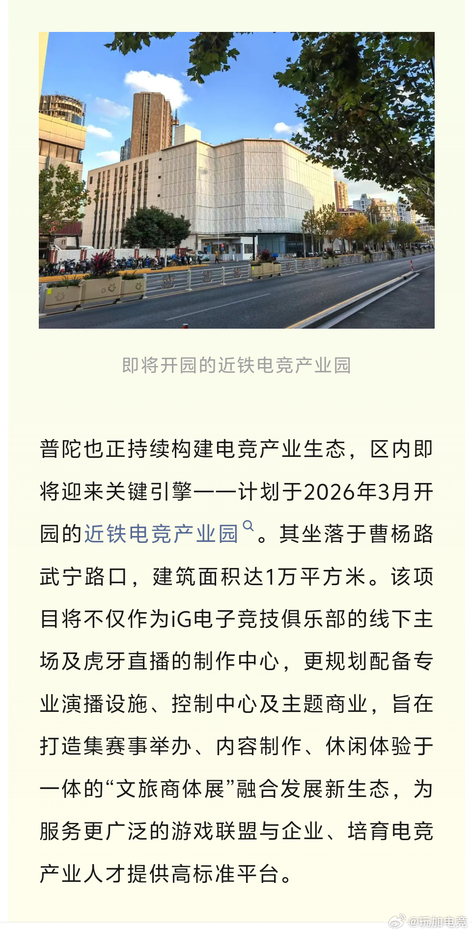 上海普陀的官方公众号于1月份写到“近铁电竞产业园计划于2026年3月开园”,对照时间不出意外的话就是第二赛段投入使用,你期待iG新主场吗?