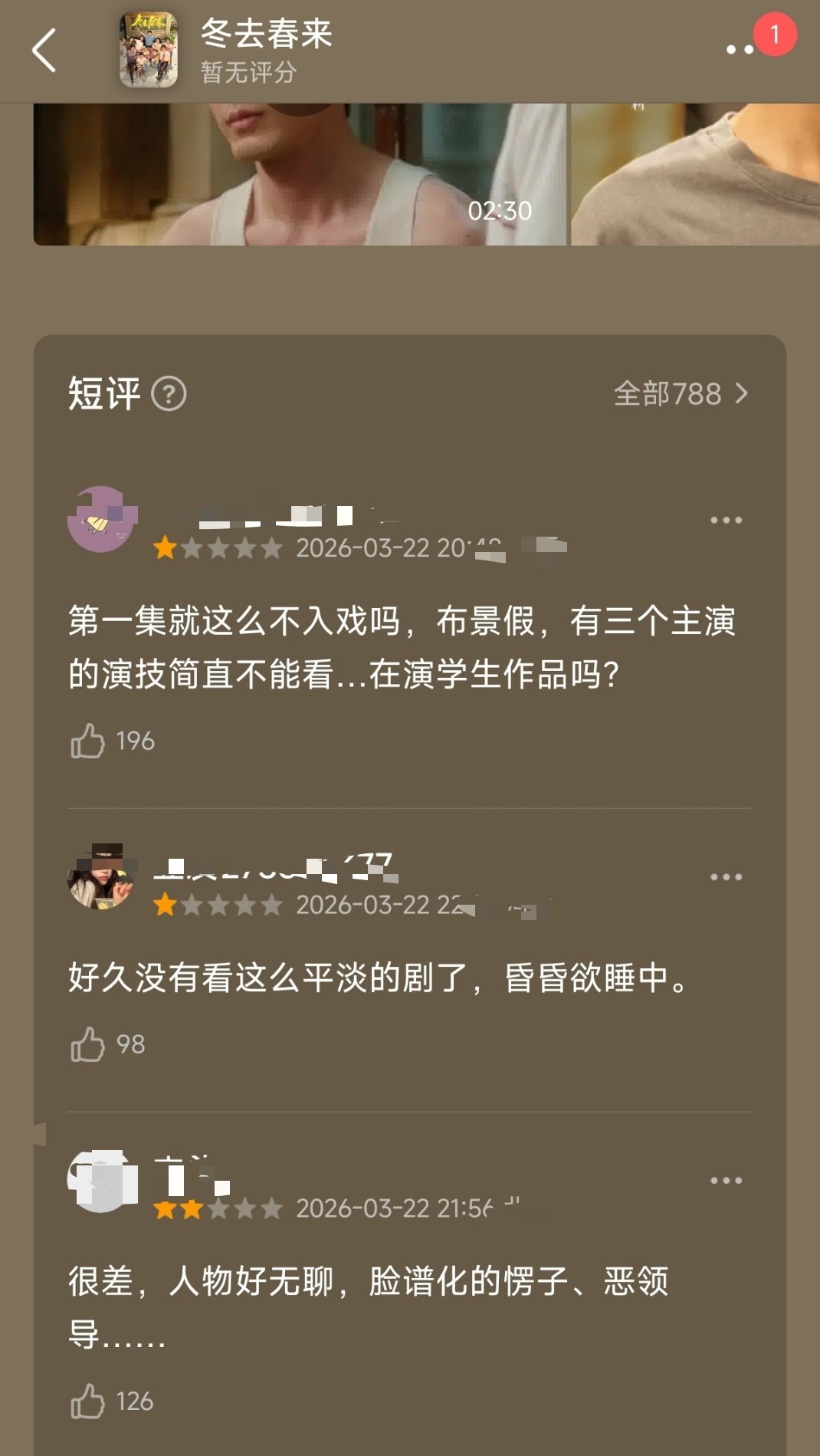 电视剧冬去春来冬去春来走势不妙了,第二天收视率直接跌了很多,网上差评也挺多的,豆瓣热门显示的都是一星评价,有没有看过觉得咋样冬去春来