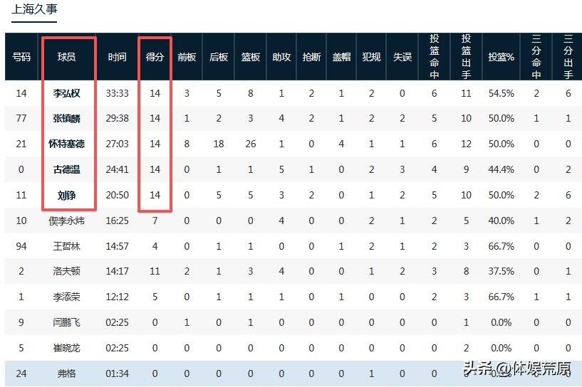 CBA奇观:十年难遇,强迫症患者舒服了,首发得分一样 上海队主场97比81战胜广东队,喜迎十连胜,同时开启首发得分全部一样的盲盒,堪称十年难遇。 这场比赛全场最高分就是14分,而14分得主两队合计多达7人,广东队徐杰14分3助攻,崔永熙14分4篮板。上海队则是首发五人全部是14分,这种景象堪比日食月食数年难遇之奇观。 其中刘铮14分5篮板3助攻,张镇麟14分4助攻,李弘权14分8篮板,古德温14分5篮板,怀特塞德14分26篮板4盖帽。我严重怀疑卢伟指导是强迫症患者,不让首发球员得更多分,同时逼迫五人都要拿到14分的高分。 这一景象在我数十年的观赛体验中还真没有见过,即便是在NBA也是难遇,体现的是首发五虎实力都很强悍啊,球队默契程度很高,球员之间有很好的化学反应。
