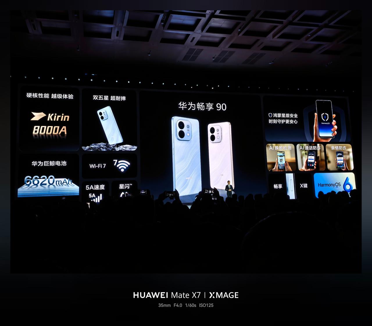 华为畅享 90 发布,8+128GB 售价 1299 元、8+256GB 售价 1599 元。和畅享 90 Plus 的区别只在于把麒麟 8000 换成了麒麟 8000A。 - 芯片:麒麟 8000A 处理器; - 屏幕:6.67 英寸 1604×720 LCD 直屏,峰值亮度 850nit,支持 120Hz 刷新率,支持湿手触控; - 相机:前置 8MP,后置 50MP 主摄; - 续航:6620mAh 巨鲸电池,40W 快充,30 分钟充电 55%; - 其他:厚 8.32mm,重 212g,星海蓝、羽沙白、星空黑 3 款配色,短焦屏幕指纹识别,蓝牙 6.0,Wi-Fi 7,IP64 防尘防水,星闪 E1.0,侧边指纹,机身保留「畅享 X 键」,可以自定义直达应用或服务,全系支持北斗卫星通信,出厂搭载 HarmonyOS 6.0 系统,支持 AI 通话防诈。