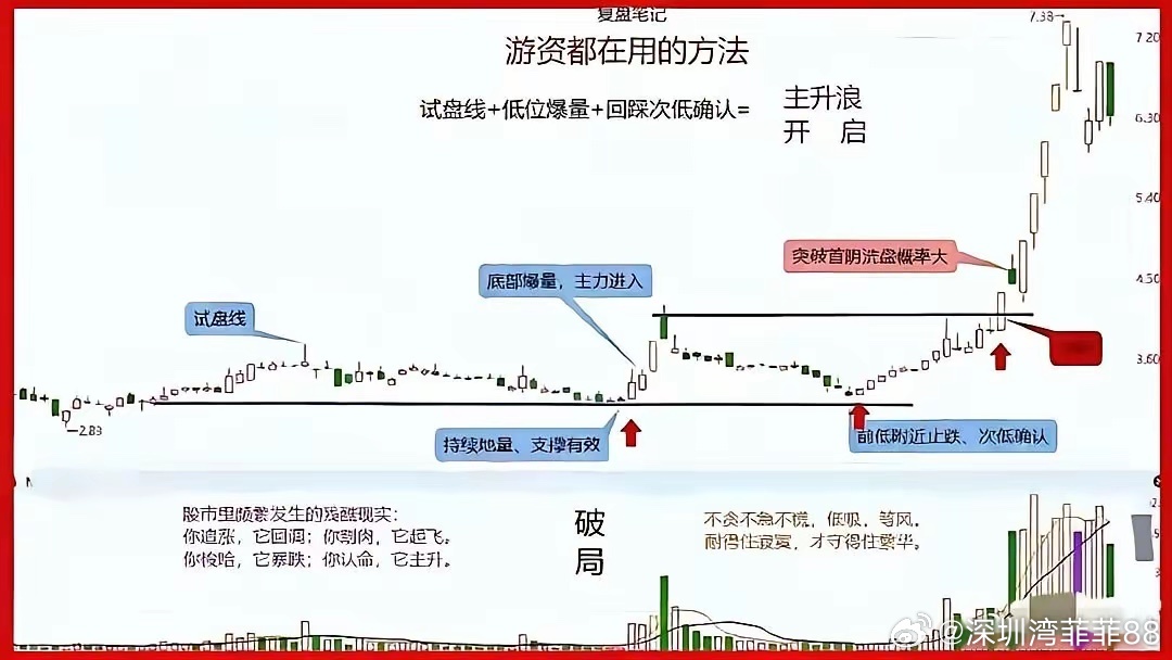 炒股的朋友都想抓住低位牛股,其实真正的低位牛股都有一套固定节奏:先试盘、再爆量、后回踩、最后起飞。很多散户总踩空,就是没摸透这底层逻辑。大资金建仓不会直接硬拉涨停,不然上方套牢盘砸盘,成本太高。所以先试盘,用少量资金拉一下再砸一下,试探上方抛压和下方承接,盘面会出现长上影或长下影线,成交量微放。接着爆量进场,收集筹码。然后回踩洗盘,把不坚定的散户洗出去。走完这三步,主升浪就快到了。吃透这节奏,就能避开诱多陷阱,抓住牛股机会。