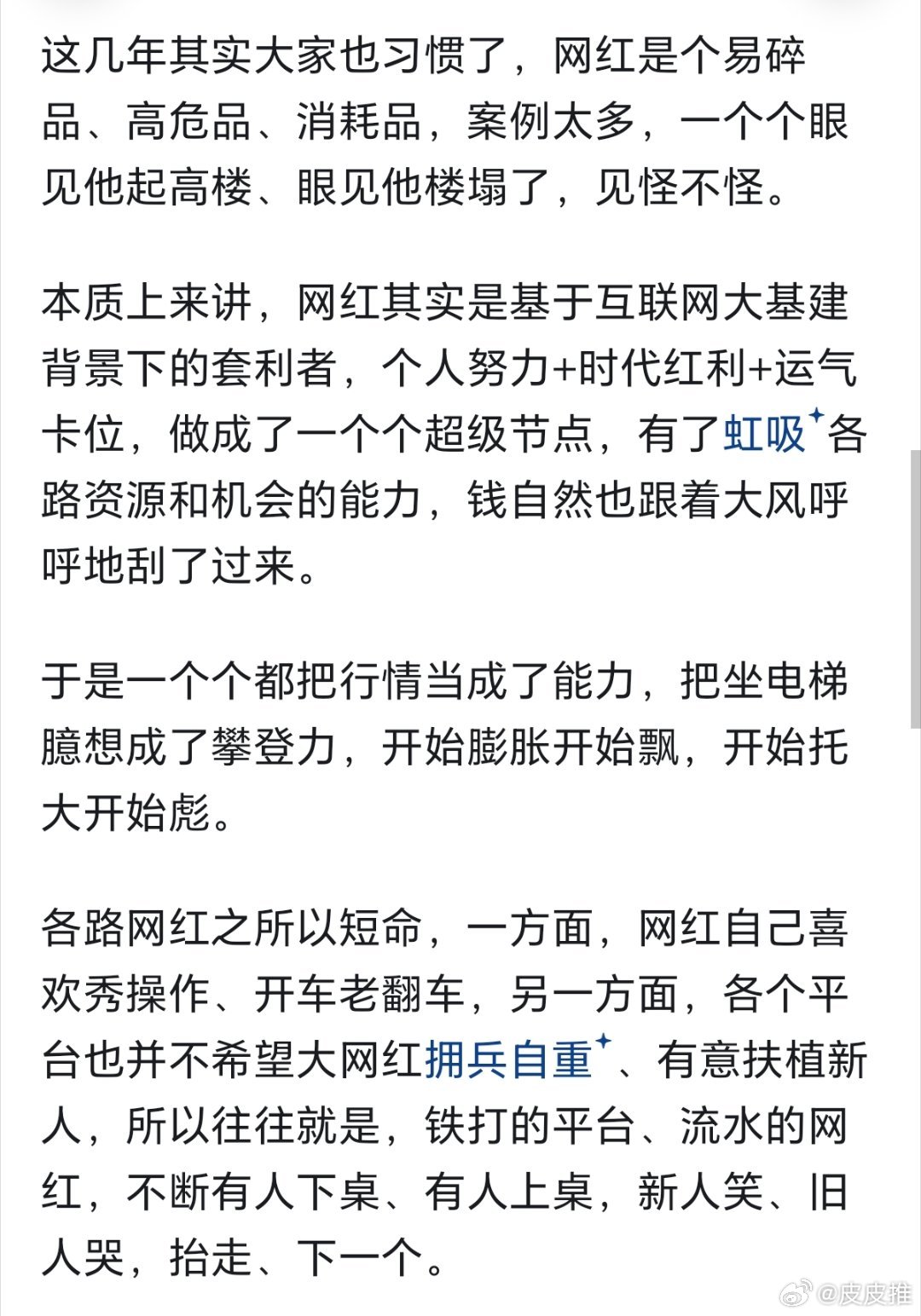 网红是个易碎品、高危品、消耗品,案例太多,一个个眼见他起高楼、眼见他楼塌了,见怪不怪。平台也不会让一个网红高度捆绑,否则网红一旦塌房,对平台反而是致命一击。科技先锋官