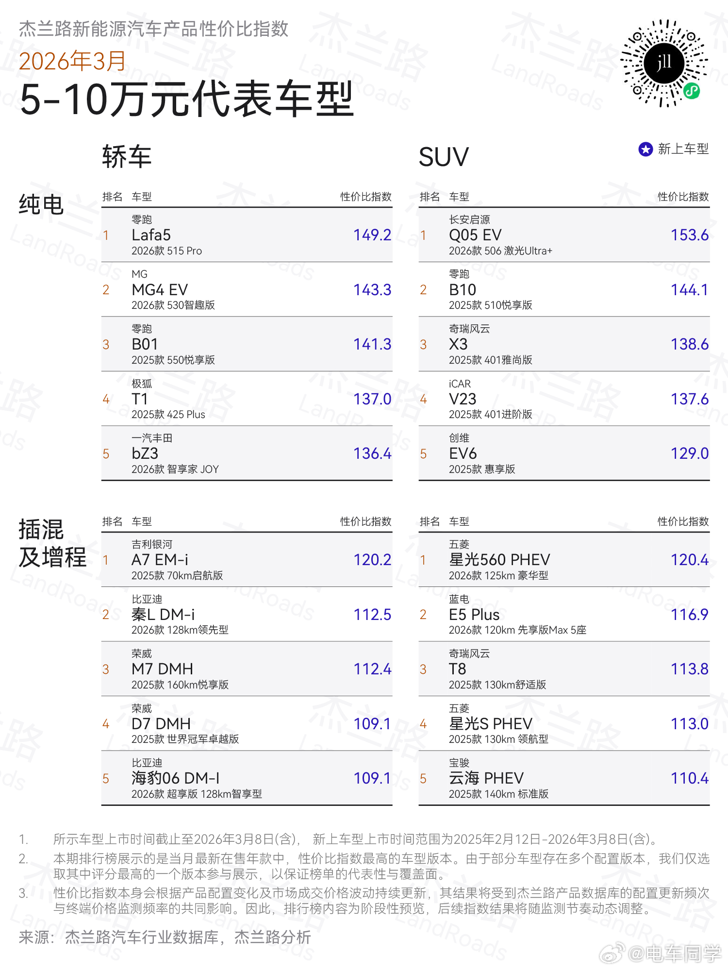 零跑快把从5万到15万的榜单包圆了…Lafa5、C11 EV、C10 EV、B10、B01、C16都出现了,现在这个价位段买车,零跑几乎就绕不开的选项。