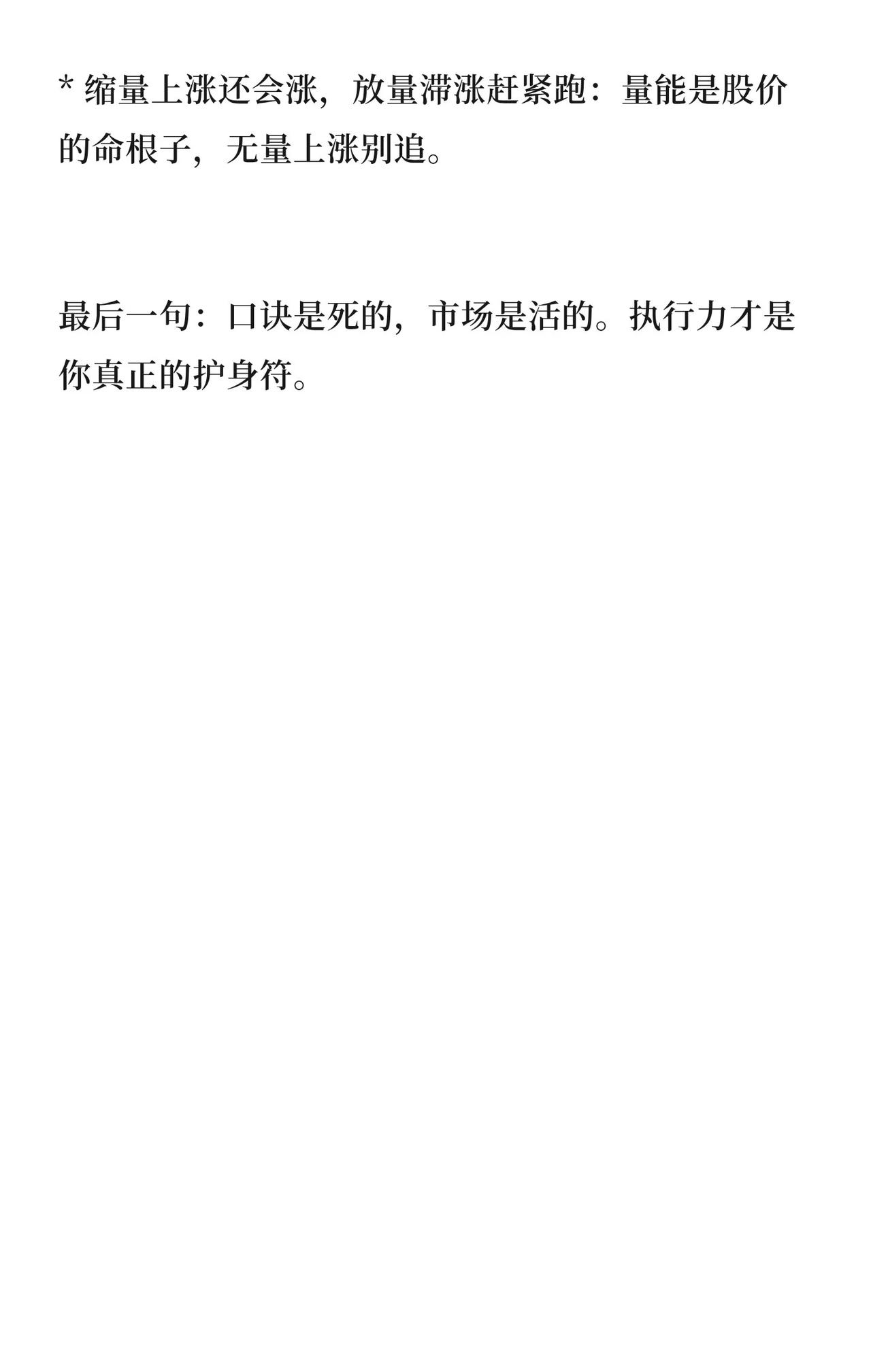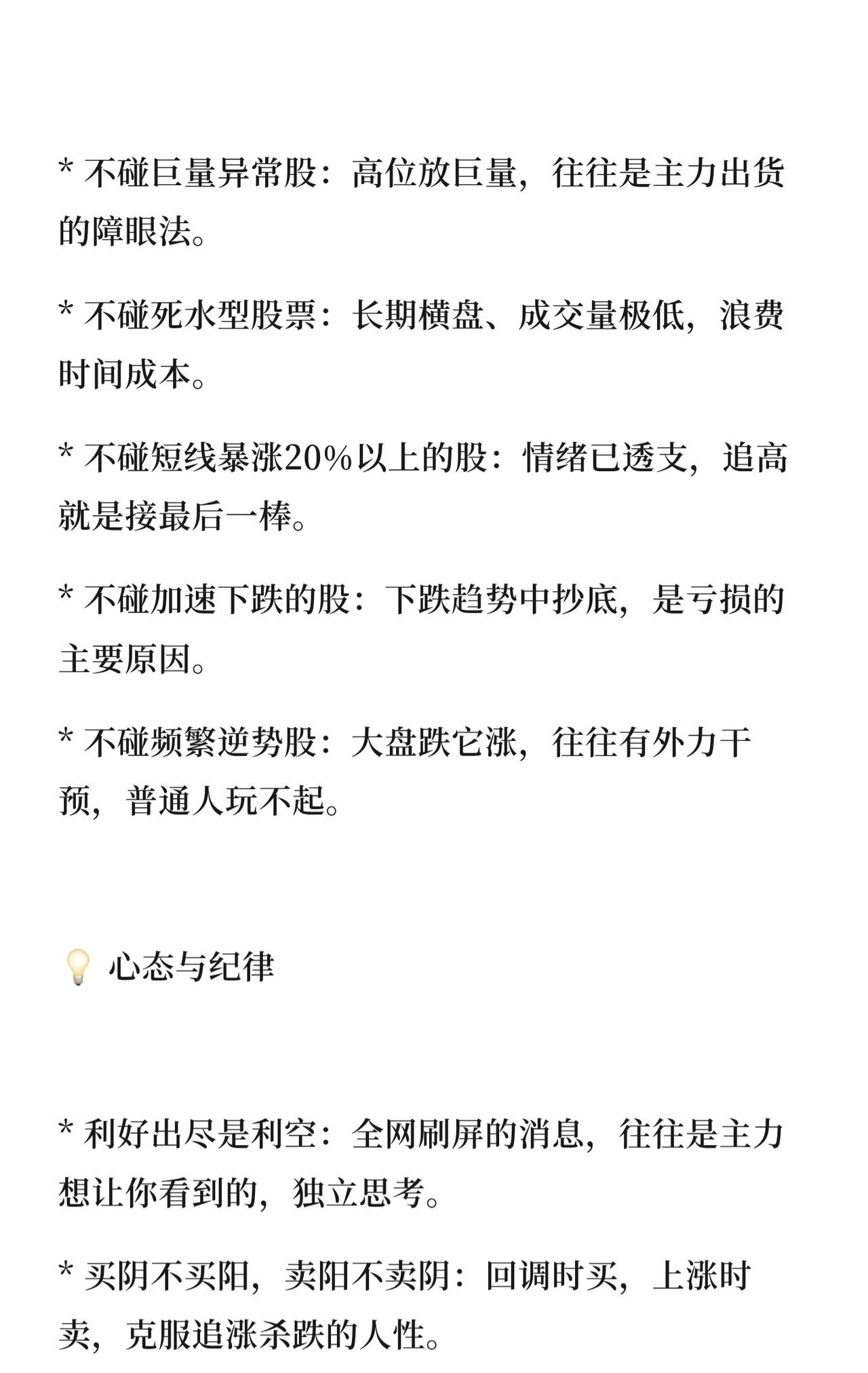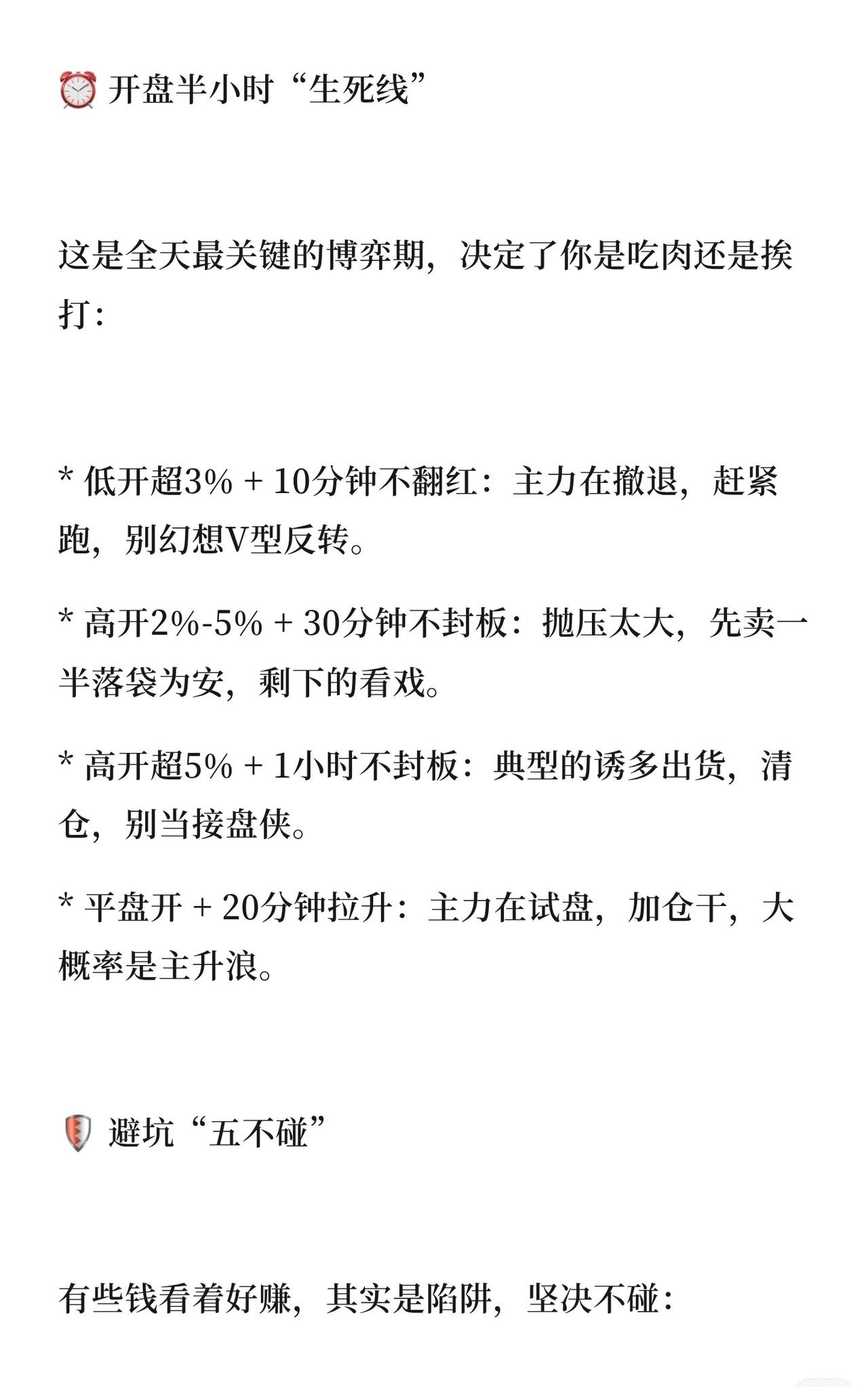 🛡️ 股市保命口诀核心总结 一、核心保命三铁律 本金优先:亏损50%需涨100%才能回本,活着才有机会。 永不重仓:保留3成现金,避免满仓被动。 破位止损:跌破5日线或关键支撑,果断离场。 二、开盘半小时操作指南 低开超3%且10分钟不翻红 → 主力撤退,立即卖出。 高开2%-5%且30分钟不封板 → 先卖一半避险。 高开超5%且1小时不封板 → 诱多出货,清仓离场。 平盘开后20分钟拉升 → 主力试盘,可加仓跟进。 三、避坑“五不碰” 不碰高位巨量股(主力出货)。 不碰长期横盘低成交量股(浪费时间)。 不碰短线暴涨超20%股(情绪透支,追高接盘)。 不碰加速下跌股(下跌趋势抄底易亏损)。 不碰频繁逆势股(外力干预,普通投资者难把握)。 四、心态与纪律 利好出尽是利空,保持独立思考。 买阴不买阳,卖阳不卖阴,避免追涨杀跌。 缩量上涨可持续,放量滞涨需离场。 口诀是死的,市场是活的,执行力才是核心。