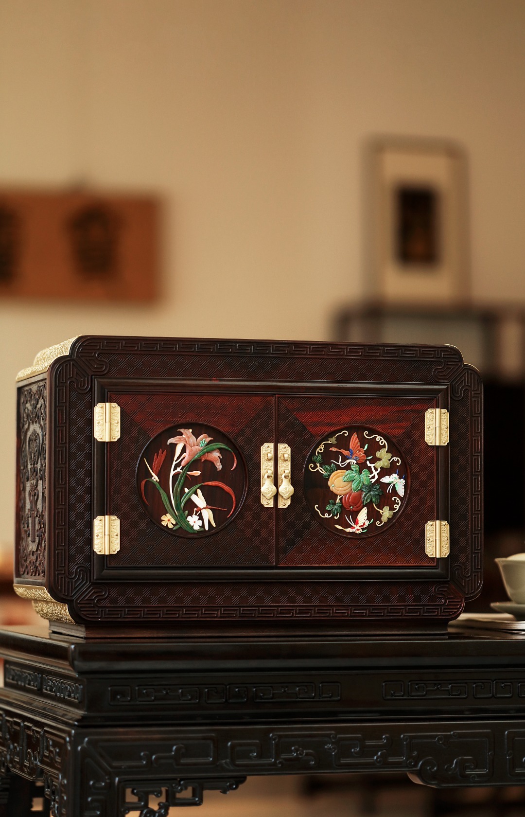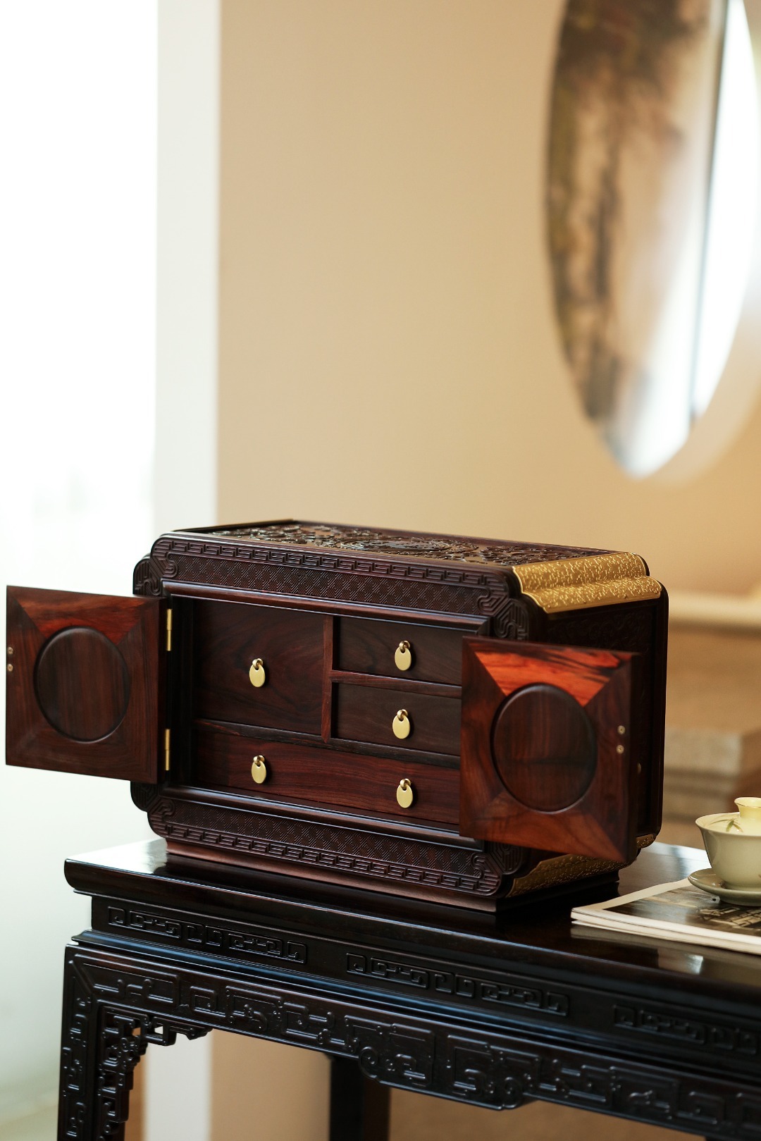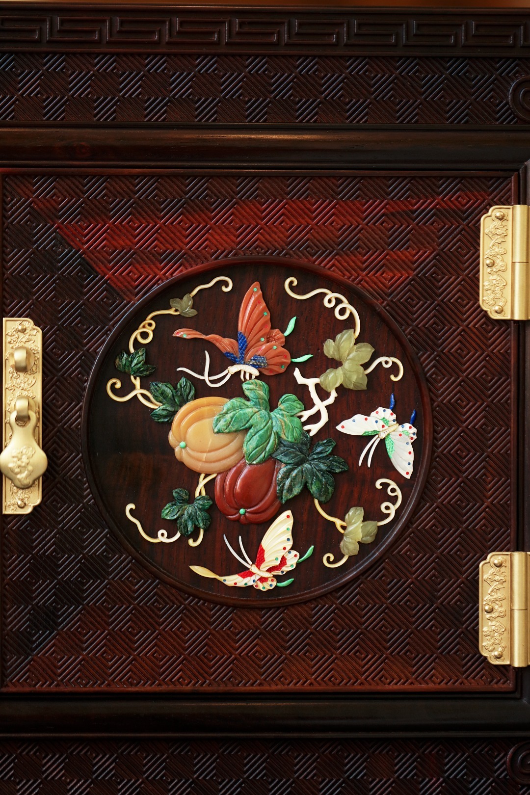 大红酸枝制, 色泽均匀纯正,满工精雕,铜件镀金,柜门百宝嵌福运连绵图,配色清雅,整体画面浑然一体,严丝合。内设多层收纳,可藏珠宝珍玩,藏用皆宜。