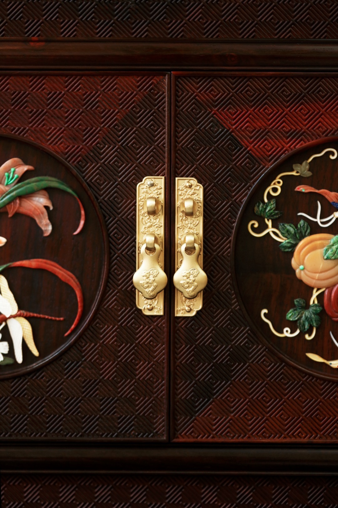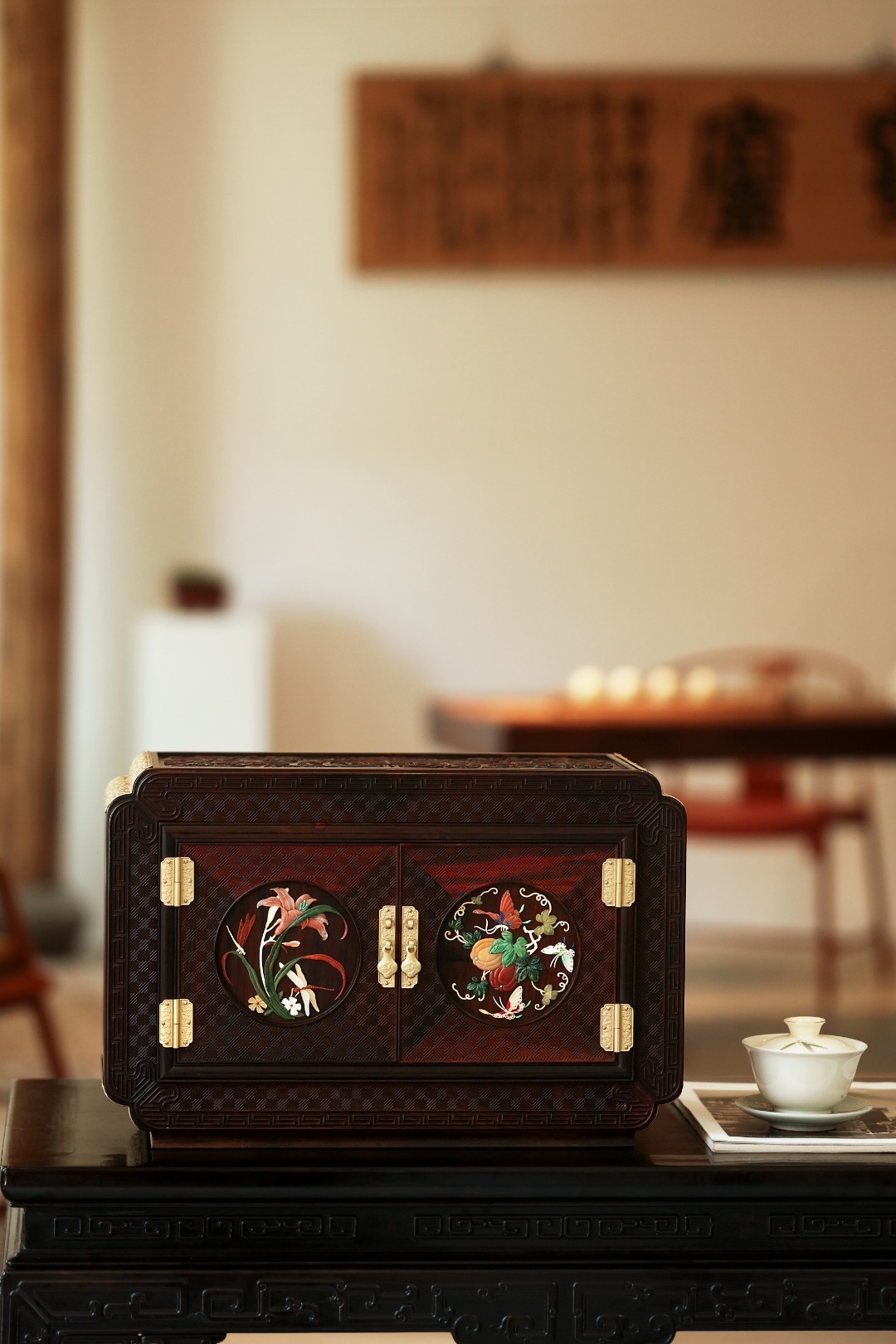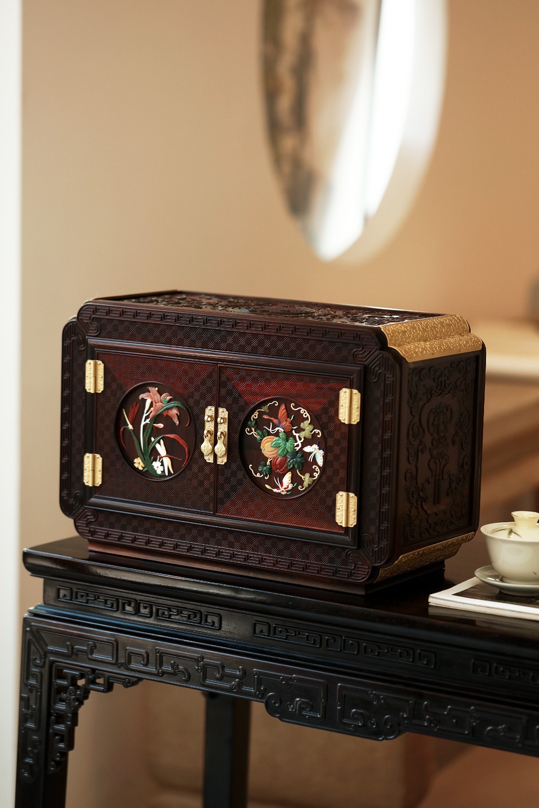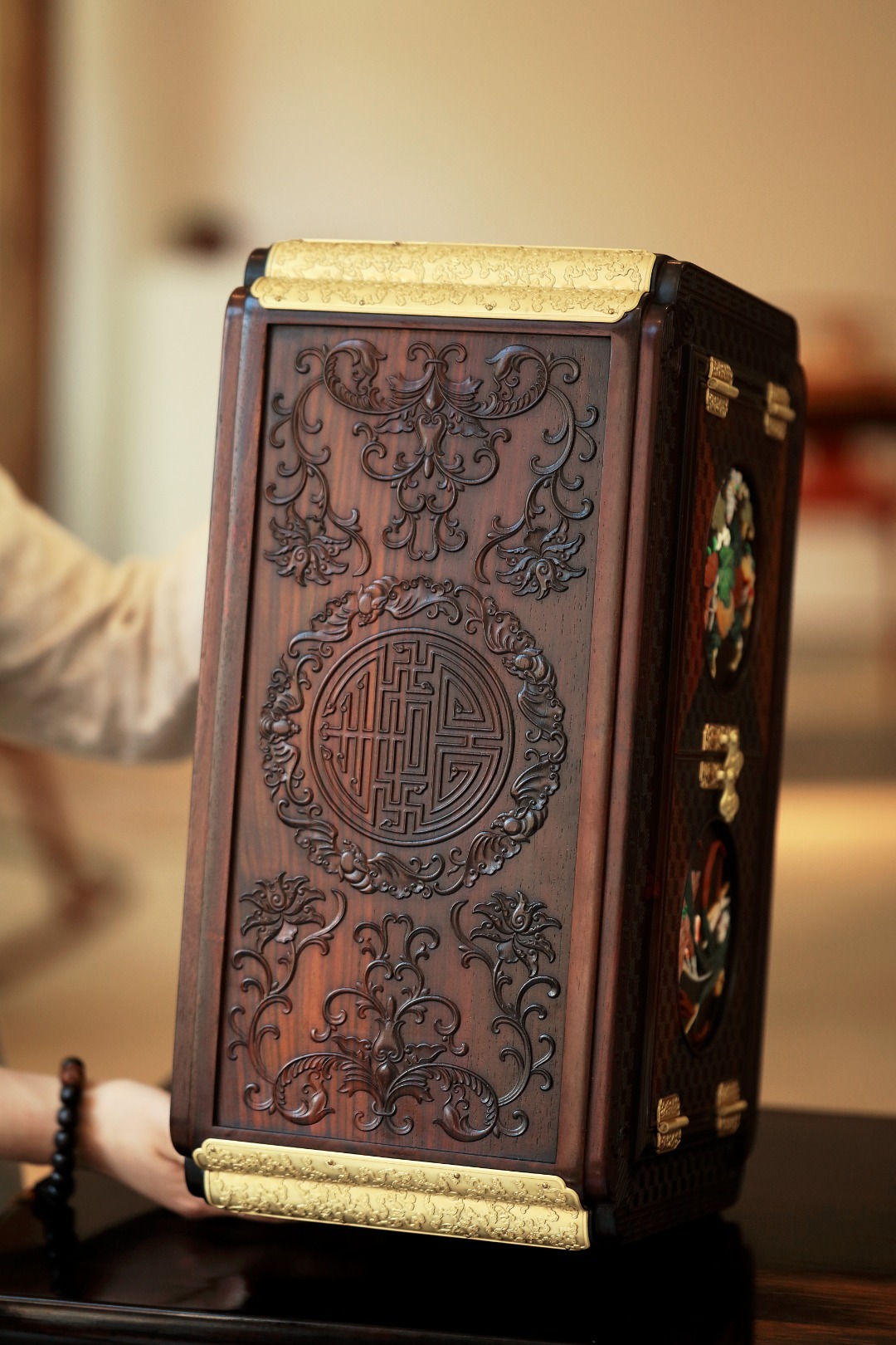 大红酸枝制, 色泽均匀纯正,满工精雕,铜件镀金,柜门百宝嵌福运连绵图,配色清雅,整体画面浑然一体,严丝合。内设多层收纳,可藏珠宝珍玩,藏用皆宜。