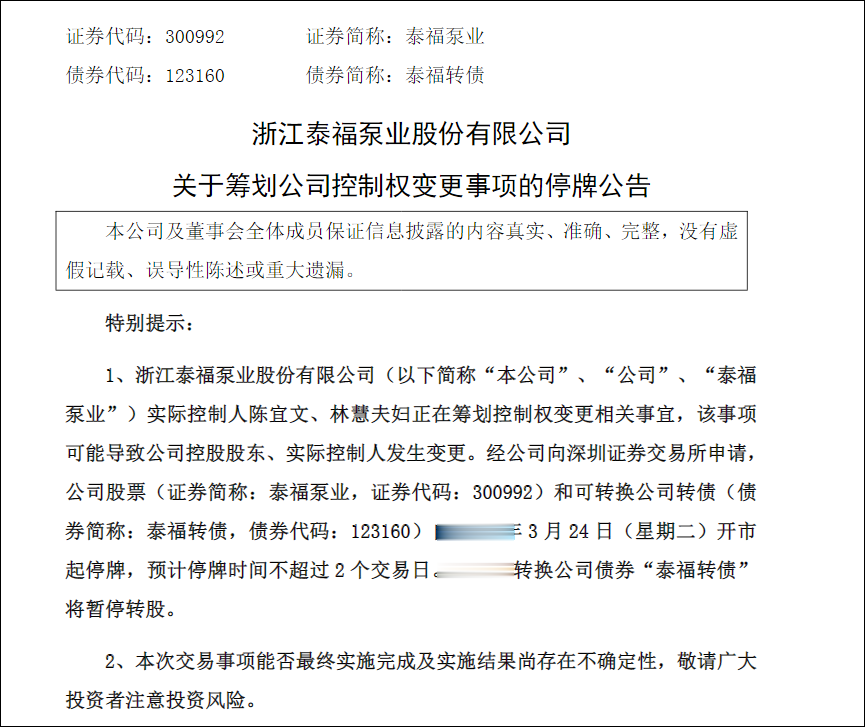 3月23日,泰福泵业(300992.SZ)公告称,公司实际控制人陈宜文、林慧夫妇正在筹划控制权变更相关事宜,可能导致公司控股股东及实控人发生变更。经向深交所申请,公司股票及可转换公司债券自2026年3月24日开市起停牌,预计停牌不超过2个交易日,其间“泰福转债”暂停转股。该事项尚处于筹划阶段,存在重大不确定性。