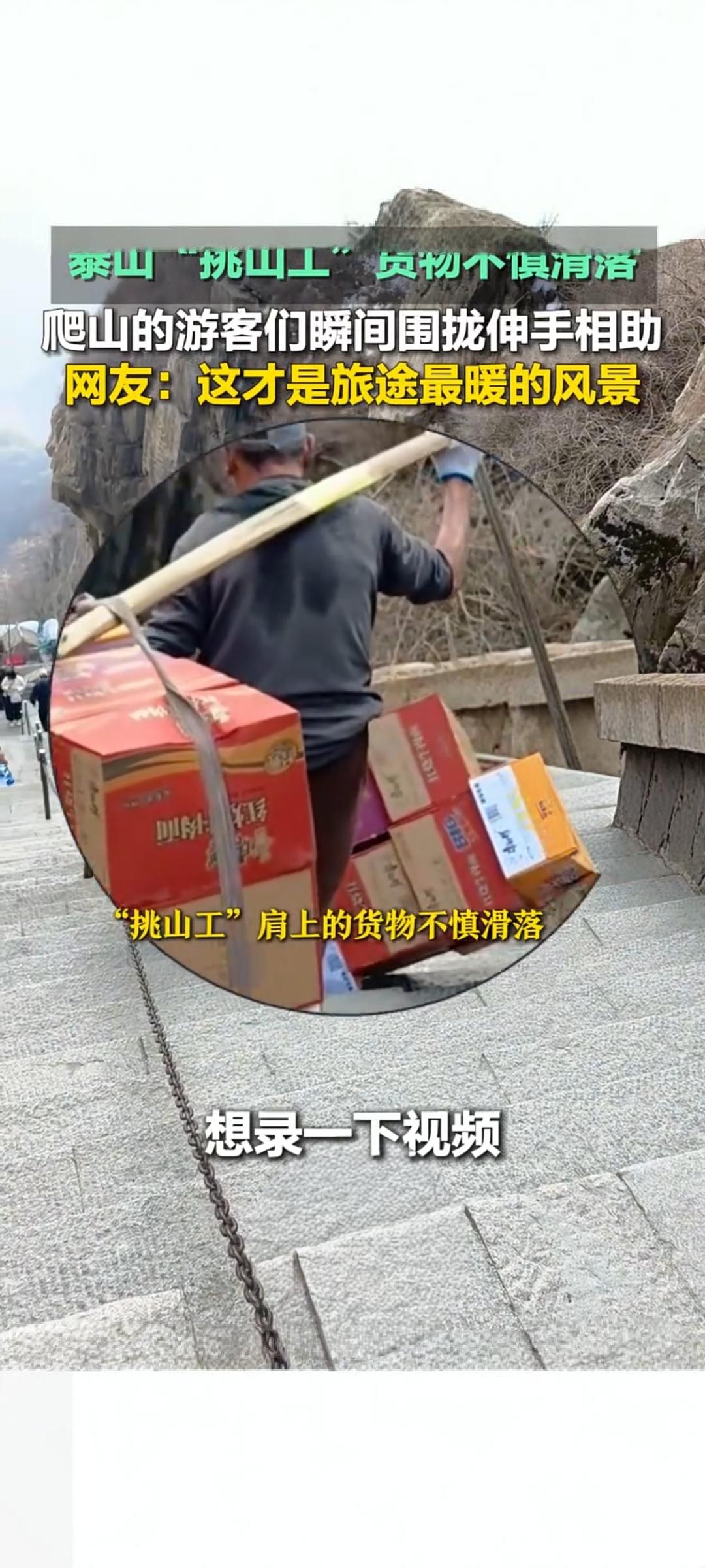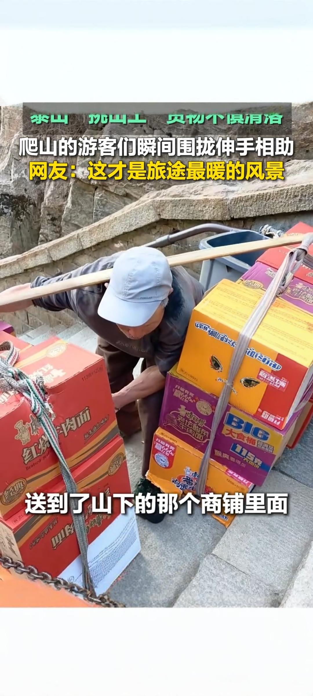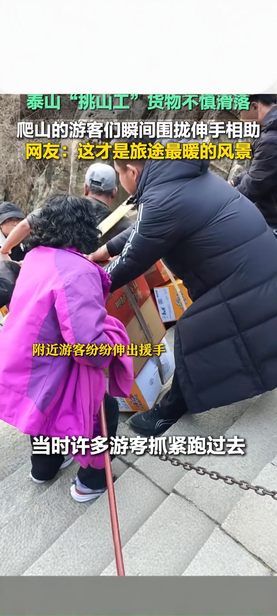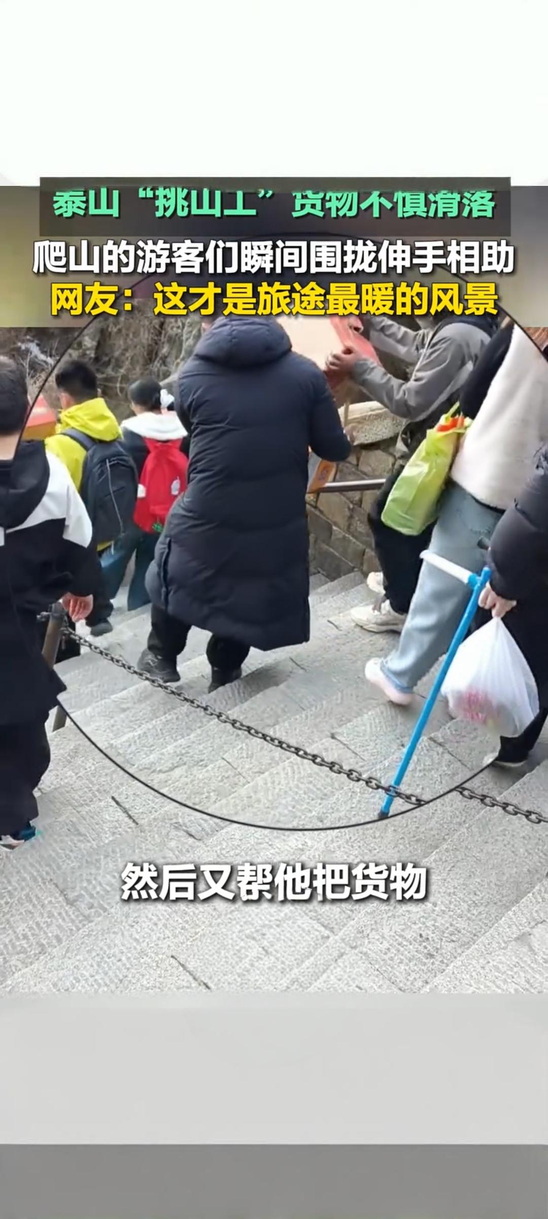 泰山挑山工货物滑落 游客暖心相助成最美风景 近日,山东泰安泰山景区发生了一幕暖心瞬间,一名挑山工在登山途中货物不慎滑落,危急时刻,现场爬山的游客们纷纷围拢过来,主动伸手帮忙捡拾、搬运货物,用善意化解了挑山工的窘境。这一温暖画面被记录下来并发布至快手平台,相关作品已收获1.2万次播放,打动了众多网友。 挑山工作为泰山景区的特殊群体,常年肩扛重物行走在陡峭的石阶上,用汗水为景区运输物资,是泰山精神的生动诠释。此次货物意外滑落,让挑山工一时手足无措,而游客们的及时援手,让原本艰难的登山之路充满温情。大家不分彼此,弯腰捡拾散落的货物,合力将物资重新整理好,助力挑山工继续前行,简单的举动尽显人间善意。 这暖心的一幕被网友纷纷点赞,有网友评论道:“这才是旅途最暖的风景。”泰山的雄奇风光令人沉醉,而人与人之间的互帮互助,更让这份风景多了一份温度。游客的善意之举,不仅传递了助人为乐的传统美德,也让泰山不仅成为自然之山,更成为一座充满温情的人文之山,让每一位到访者都感受到旅途里的温暖与美好。 最苦挑山工 挑山工货物散落