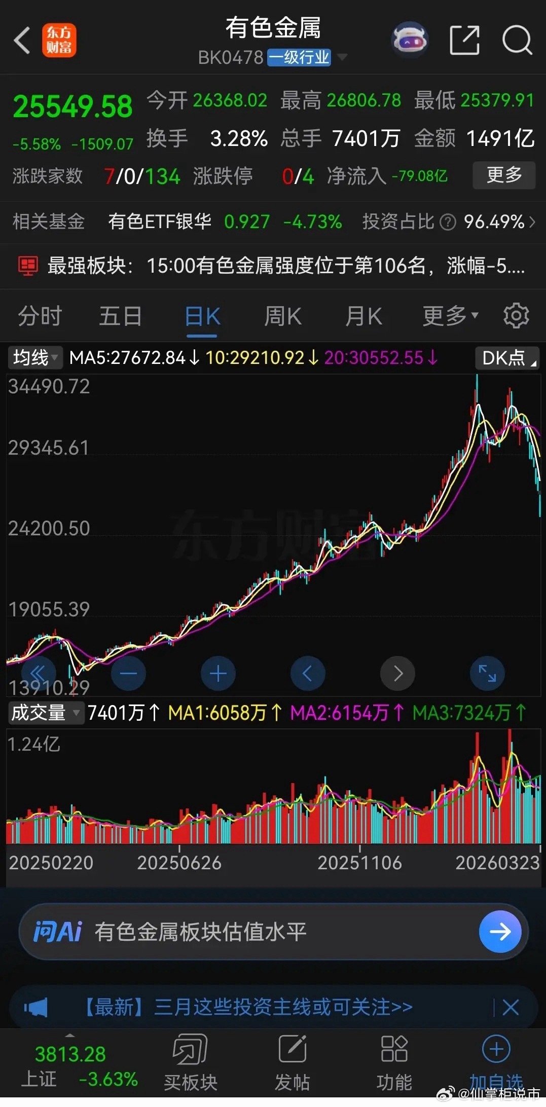 有色金属板块去年四月份关税贸易战时最低只有13910点,到了今年一月底,最高涨到了34490点,板块指数9个月时间上涨2.5倍,如果从底部算起的话已经上涨了近6倍。