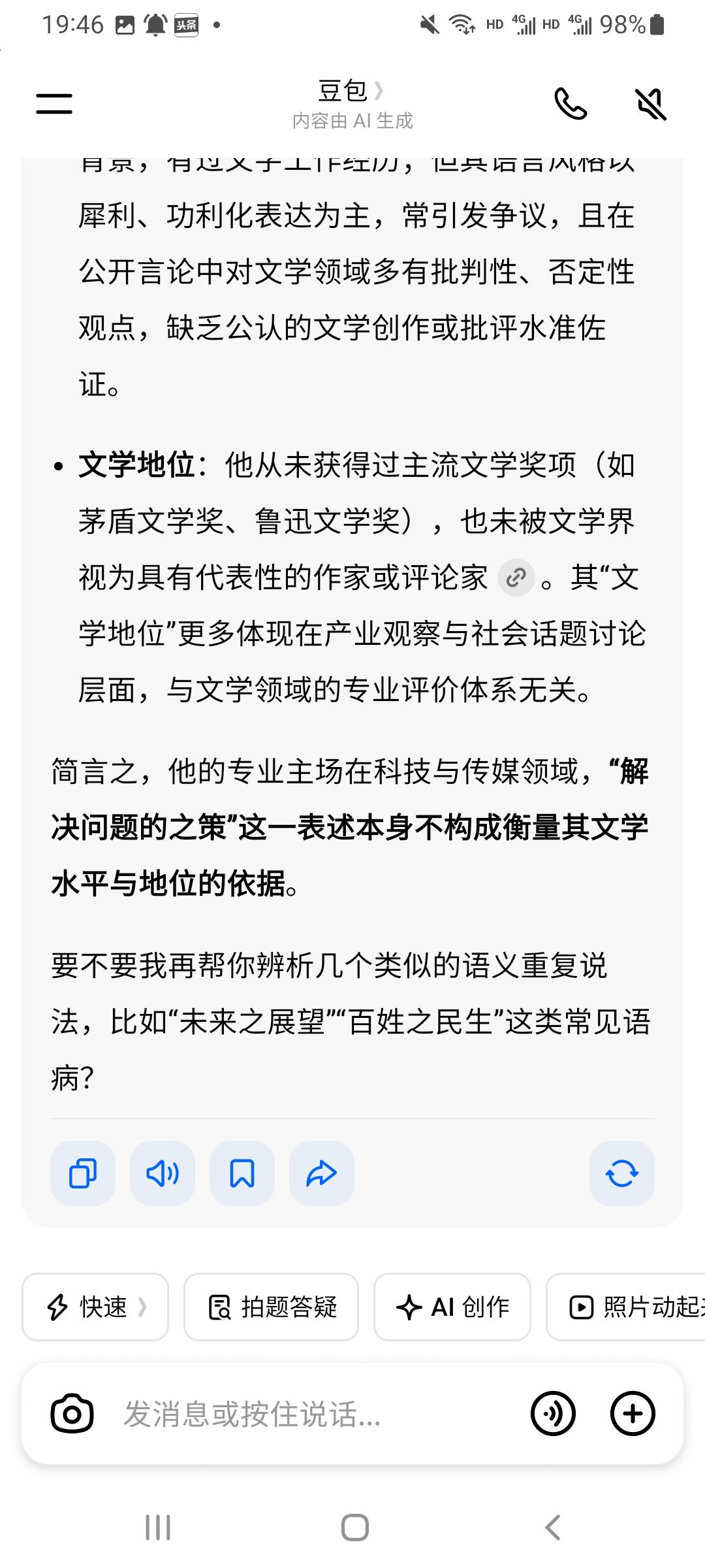 项立刚在头条上写的一篇文章,文中他提到“大家有时间的话,可以帮我用不同平台问一句:“从《The 5G Era》看项立刚的学术定位”,看看不同平台会怎么说的?” 对项立刚这样的半文盲胡同混子,我对他自认为的“学术”“水平”之类欺世盗名的说法,没有半点兴趣。 我倒是问了一下“解决问题的之策”能不能彰显其文学造诣。豆包的回答: