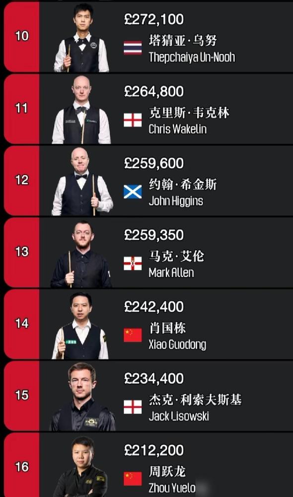 眼睁睁看着150万奖金被泰国人拿走,但你先别急着骂,这事还有后续。 世界公开赛刚打完,泰国选手塔猜亚口袋里揣走17.5万英镑,赵心童和吴宜泽最后关头也挤进了巡回锦标赛。 这巡回锦标赛可不是闹着玩的,单赛季前16才能进场,桌上全是狠人,每一杆都可能决定生死。 丢掉的是一座奖杯,锁住的是更高的席位;放下的是一时的遗憾,扛起的是所有人的期待。