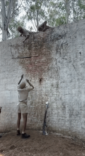 中印集体爬墙对比,印度的爬墙延续了他们阅兵时的松弛感,一步都不跑,全凭队友拿枪怼着屁股,怼着脚底板顶上去。 第一个是爬的最快的,因为队友拿枪托顶起来是没轻没重的, 第二个就很鸡贼,爬到那里不动了,必须有人顶他的脚底板。 第三个应该算最轻松的,下边拿枪托顶着脚底板,上面两个人直接拉上去了。 第四个踩着队友的脑袋也是被拽了上去。 第五个,应该是实力最强的,借着枪托,自己爬了上去。 整体看下来速度也太慢了,建议他们向印度直升机索降学习,那速度真的是冠绝全球。 再来看看我们的士兵是如何团体翻墙的。 首先,是两位战友踩着战友的后背,凭借着反蹬作用力,就爬了上去,身轻如燕。剩下的一位战友,拽着战友的脚直接上墙成功。 整体看起来就很舒服,节奏感把握的非常好。