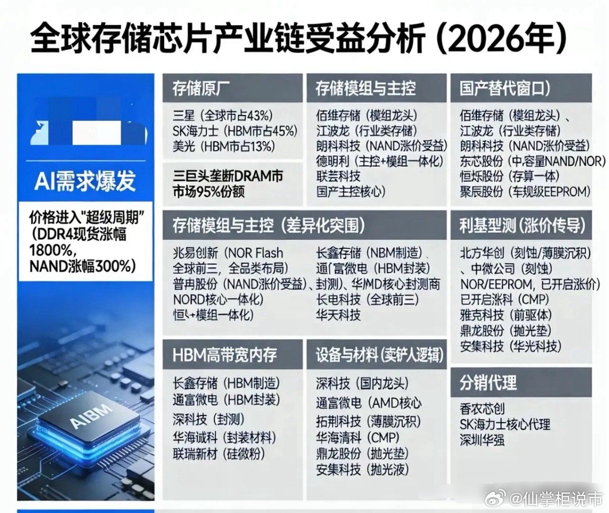 Wedbush发布重磅研报!存储芯迎来“黄金时代”,全球巨头都在抢!存储市场惊天变局!3月23日,Wedbush最新报告引爆科技圈:DRAM与NAND价格即将开启“三位数”暴涨,2026年上半年部分产品涨幅突破100%,DRAM更是剑指130%-150%的惊人涨幅。这场涨价海啸的核心推手,正是AI算力需求的疯狂井喷!数据中心与AI训练对高带宽存储的渴求呈指数级增长,三星、SK海力士等巨头纷纷将产能转向利润更高的企业级产品,消费电子领域的存储芯片供应被严重挤压。全球DRAM库存已从2024年底的17周断崖式跌至2-4周,供应紧张程度堪比“芯片荒”最严重时期。涨价潮早已从芯片端蔓延至终端市场,智能手机行业被迫开启提价降配模式,旗舰机型内存从16GB下调至12GB已成常态;PC整机售价预计上涨15%-20%,入门级笔记本电脑正逐步退出市场。发改委最新价格监测中心数据显示,截至2026年1月,DRAM和NAND闪存价格均已创下2016年有统计以来的最高值,部分型号现货价格累计涨幅高达369%。这场由AI引发的存储革命,正在重塑整个电子产业格局,存储芯片已从普通元器件跃升为战略资源。散户怎么办?请盯紧涨价直接受益——国产替代产业核心个股!