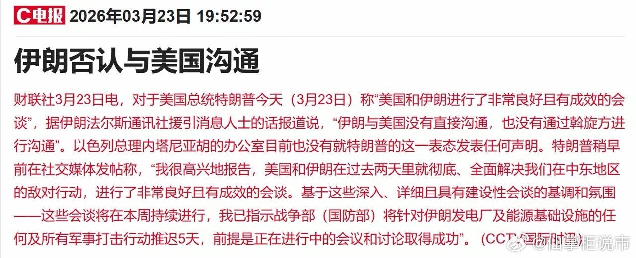 又来反转了,股民散户现在是一头雾水,今晚的消息是真的多!这仗打的是越来越不严肃了,懂王似乎已经在找台阶了,周二的A股要直接高开反弹了:1、今晚消息真真假假有点多,先给大家梳理一下:一是懂王称“推迟5天军事行动”,并称过去两天进行了富有成效的对话;(找台阶)二是伊方随后快速回应说没有任何沟通对话;(不给台阶)三是懂王称“非常有意向与伊朗达成协议”(继续找台阶)四是美方称美伊通过三国外长传话(继续找台阶)五是懂王称美伊或在5天内达成协议;(继续释放缓和信号)2、受这些消息影响,今晚的金融市场波动也是比较剧烈;一方面是原油快速大跌,布油最多的时候跌至96美元,之后又跌幅收窄,刚刚又开始回落,目前跌幅10%左右;另一方面则是各大金融市场开始反弹,日经225指数期货夜盘涨超4%,富时A50指数涨超1%,欧洲股市集体反弹上涨,恒生指数期货涨超2%;从金融市场表现来看,懂王求和发表之后,金融市场情绪转为兴奋,伊方辟谣之后情绪回落,但是随着“缓和信号”再次出现,股市夜盘再次上涨,原油价格继续大跌;3、明天周二的A股市场会如何走?虽然说消息多变,但是整体是利好为主,因为局势出现了一些反转缓和,这对于明天全球金融市场反弹修复是利好;只是从盘后消息面来看,这仗打的是越来越不严肃了,像是耍猴一样,来来回回最终亏损的还是股民散户;今天亚太股市上演黑色星期一,而晚上美股开盘前又放出缓和利好,今晚美股则是躲过了该有的大跌;而白天大盘跌破3800点,很多人恐慌割肉离场了,情绪也非常的悲观;结果今晚全球市场风险偏好开始回升,明天不出意外就要反弹修复;所以,这场仗打到最后,我觉得很多股民散户就一直被当做韭菜不断被收割了;今天有一个真实的数据:南向资金今日净买入超297亿港元,这是年内单日买入额次高;这说明在今天这样的至暗时刻,是有大资金在逆势抄底港股市场的筹码的;今夜不出意外的话,明天亚太股市高开基本上已成定局,今晚美股三大指数已经集体出现高开,而A股市场也有望出现一定的高开反弹修复;短期来看,尽管说还有不确定因素,但“缓和信号”已经出现,做空资金砸盘也会谨慎,多头可能还会犹豫,但是短期压制的做多情绪大概率会在明天释放;所以,不要倒在黎明前的黑暗里才是关键,当下是以不变应万变,股民散户在这样的市场是最被动的,持仓的就躺平,观望的就多观察等待右侧;认可的点赞,关注我,