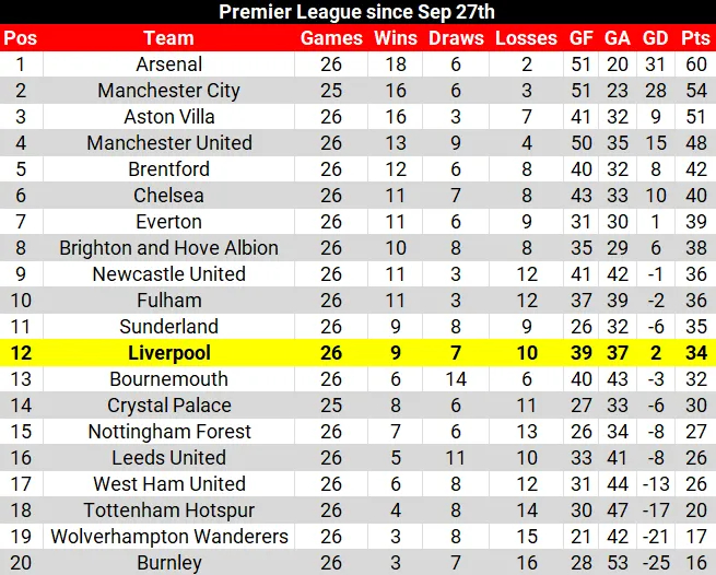 如果计算近期 26 场的英超积分榜 —— 仅排第 12 ⚠️