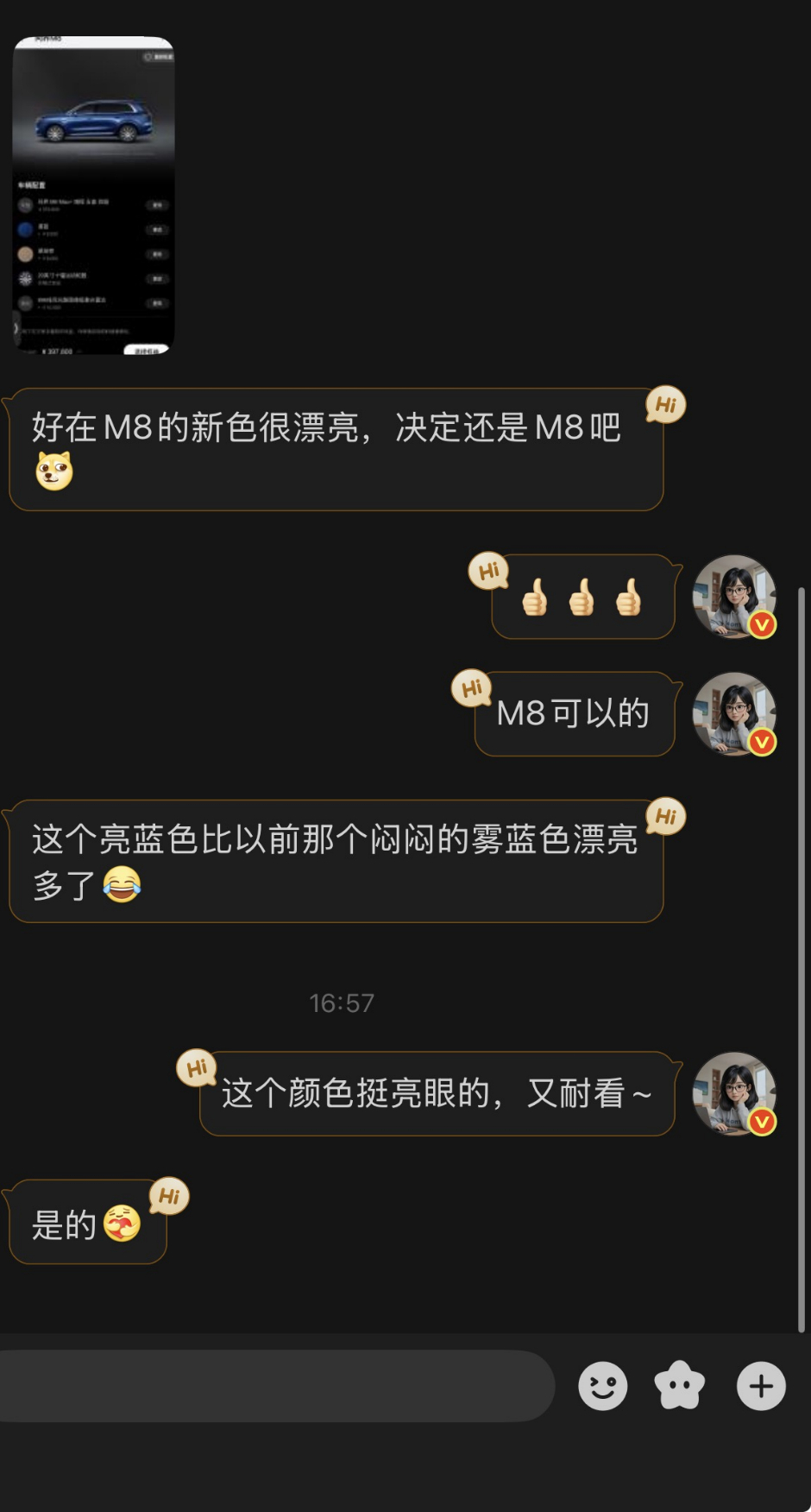 今天有位粉丝朋友准备下单问界M8了~他是种草了新的湛蓝色,还选了新的896线激光