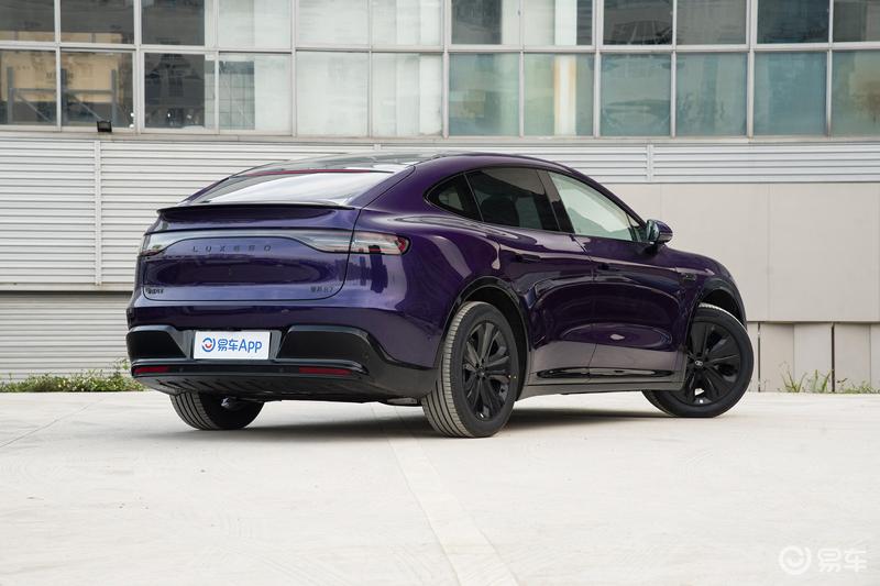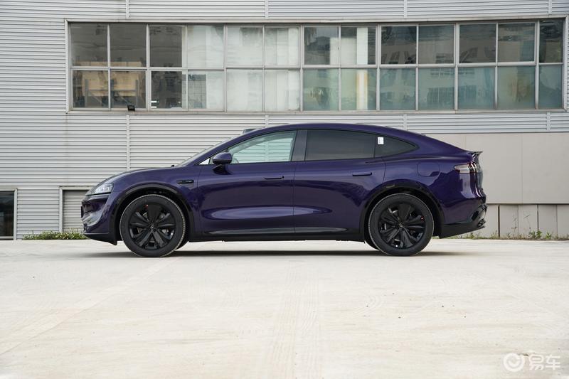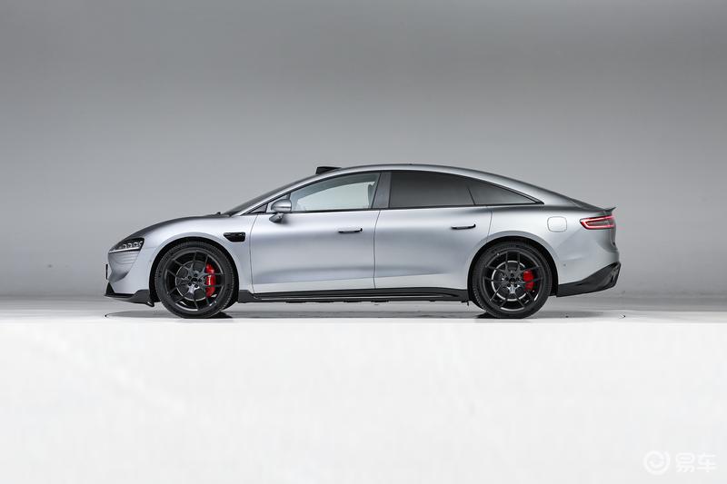 车身侧面,新车整体造型颇为饱满,在大溜背布局和隐藏式门把手、无框车门以及哑光镂空双五辐式轮毂等设计细节的加持下,能充分展现其侧颜的动态美感与时尚成分。