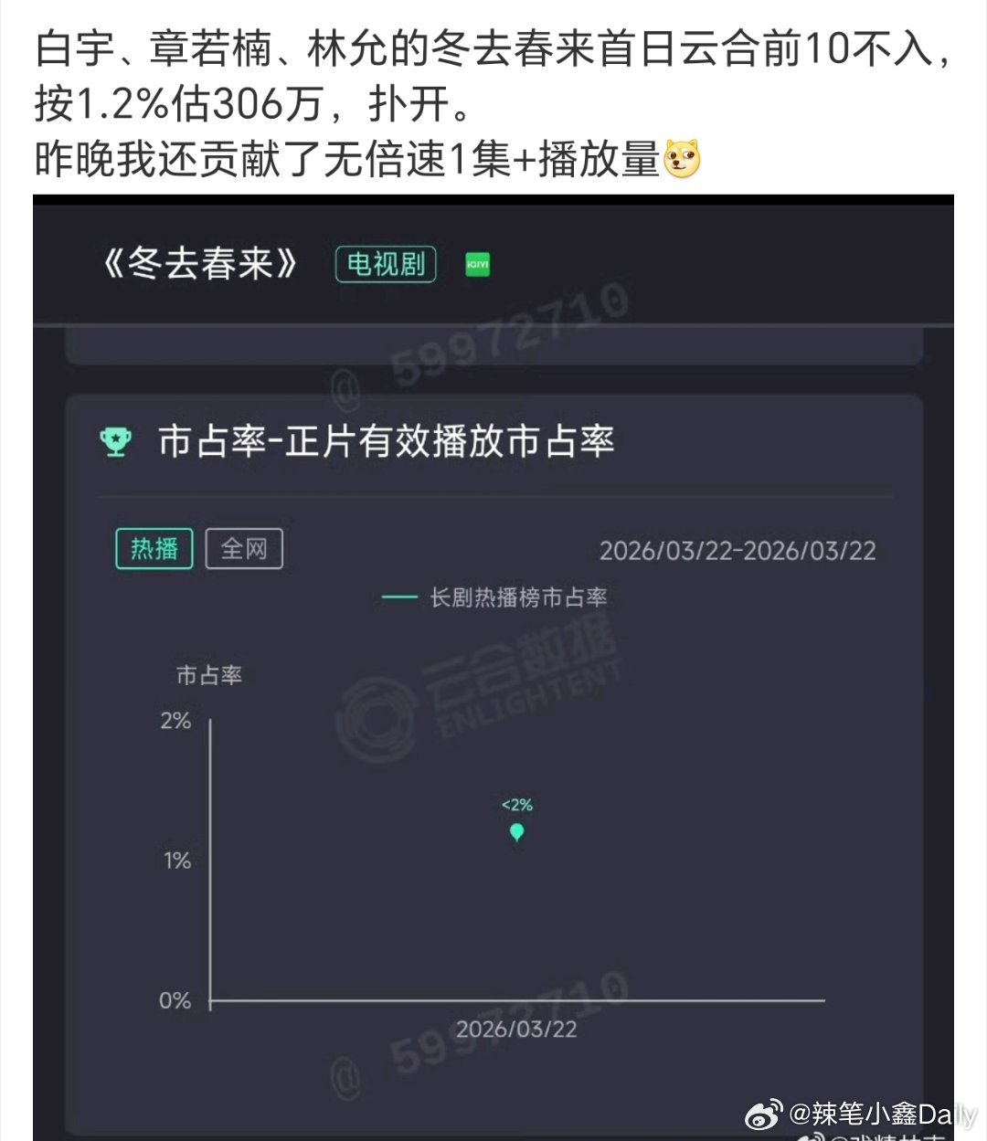 电视剧冬去春来我就说不要吹太狠,《冬去春来》开播第二天台网双扑,昨天因为接了个高底盘收视率破2.5,今天直接跌到2.1,按照现在情况可能还会继续跌的,至于网播就更虐了,开播首日云合集均300w,白宇和章若楠还真是一点都不扛剧!