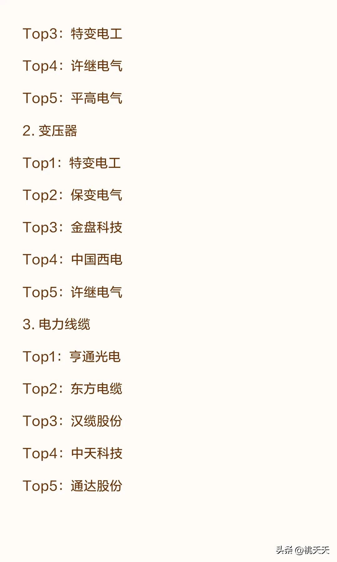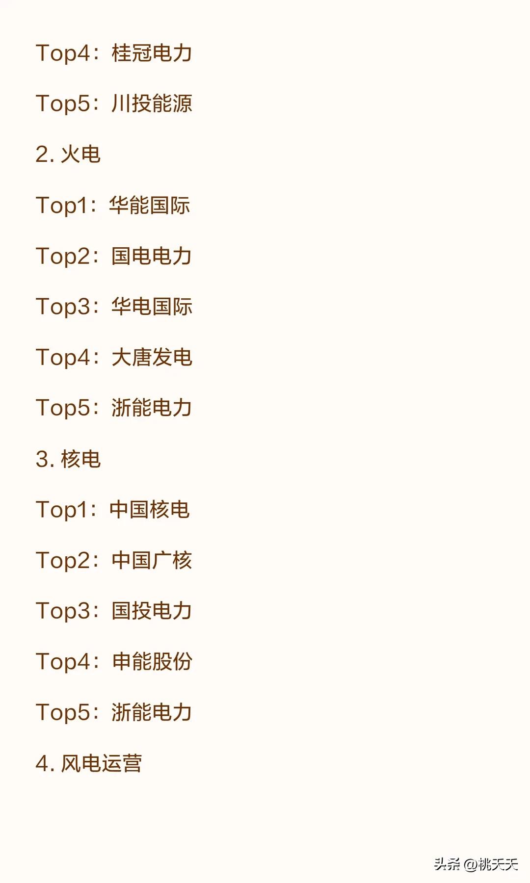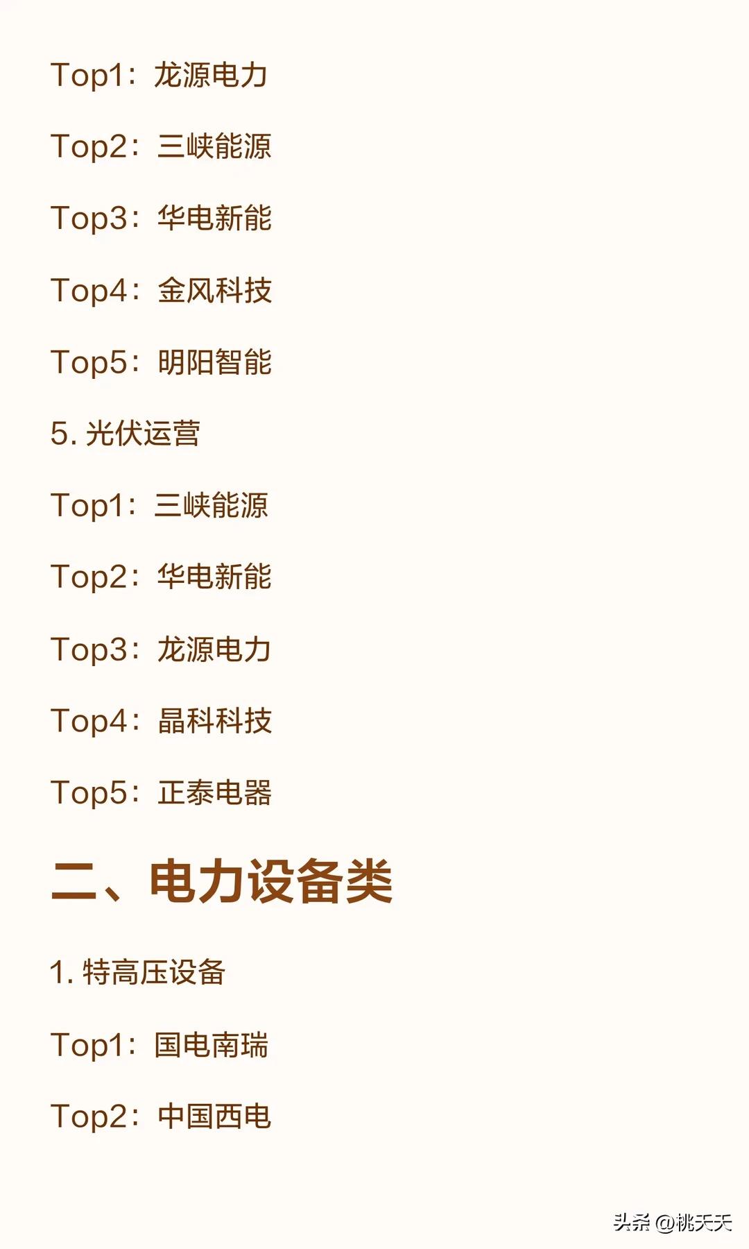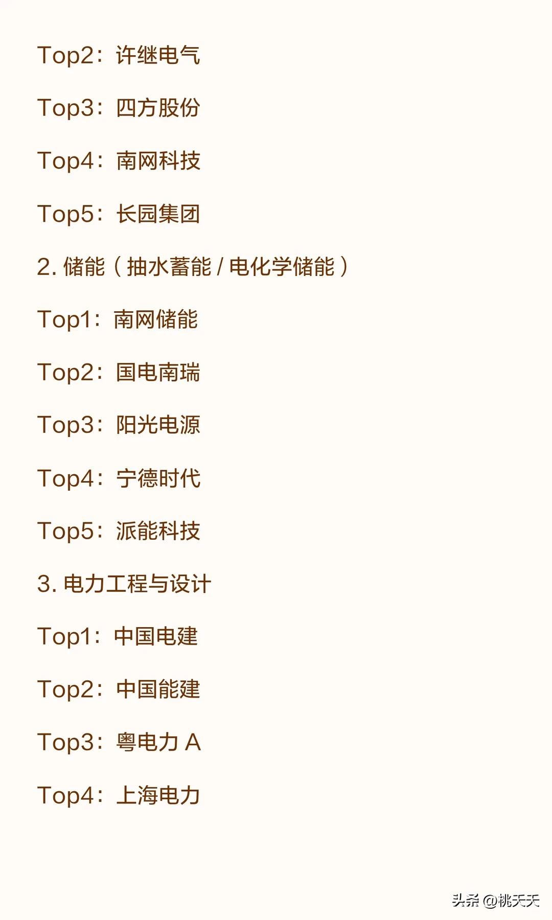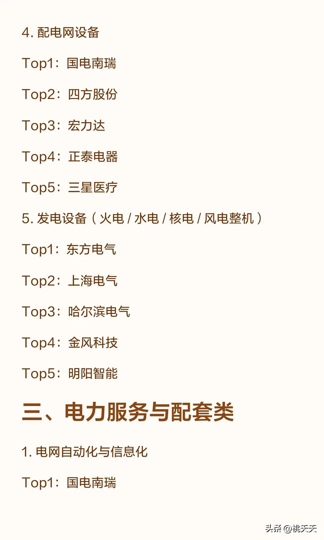 重磅!!电力板块各细分领域龙头梳理 ……… 一、发电运营类 1. 水电(含抽水蓄能) Top1:长江电力 Top2:华能水电 Top3:国投电力 Top4:桂冠电力 Top5:川投能源 2. 火电 Top1:华能国际 Top2:国电电力 Top3:华电国际 Top4:大唐发电 Top5:浙能电力 3. 核电 Top1:中国核电 Top2:中国广核 Top3:国投电力 Top4:申能股份 Top5:浙能电力 4. 风电运营 Top1:龙源电力 Top2:三峡能源 Top3:华电新能 Top4:金风科技 Top5:明阳智能 5. 光伏运营 Top1:三峡能源 Top2:华电新能 Top3:龙源电力 Top4:晶科科技 Top5:正泰电器 二、电力设备类 1. 特高压设备 Top1:国电南瑞 Top2:中国西电 Top3:特变电工 Top4:许继电气 Top5:平高电气 2. 变压器 Top1:特变电工 Top2:保变电气 Top3:金盘科技 Top4:中国西电 Top5:许继电气 3. 电力线缆 Top1:亨通光电 Top2:东方电缆 Top3:汉缆股份 Top4:中天科技 Top5:通达股份 4. 配电网设备 Top1:国电南瑞 Top2:四方股份 Top3:宏力达 Top4:正泰电器 Top5:三星医疗 5. 发电设备(火电 / 水电 / 核电 / 风电整机) Top1:东方电气 Top2:上海电气 Top3:哈尔滨电气 Top4:金风科技 Top5:明阳智能 三、电力服务与配套类 1. 电网自动化与信息化 Top1:国电南瑞 Top2:许继电气 Top3:四方股份 Top4:南网科技 Top5:长园集团 2. 储能(抽水蓄能 / 电化学储能) Top1:南网储能 Top2:国电南瑞 Top3:阳光电源 Top4:宁德时代 Top5:派能科技 3. 电力工程与设计 Top1:中国电建 Top2:中国能建 Top3:粤电力 A Top4:上海电力 Top5:内蒙华电 以上内容根据官方数据梳理,不作任何投资建议。我是桃夭夭,持续为您分享最新财经消息,记得点个关注! 温馨提示:以上所有观点供大家交流讨论,不涉及任何投资建议,请大家别盲目跟风,盈亏自负!成年人要有自己的判断。 电力股排名 电力行业股票 电力设备股 电力四大赛道 A股电力 电力重组概念股 电力行情